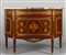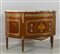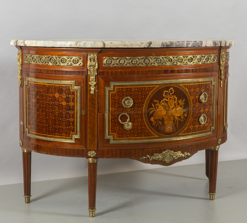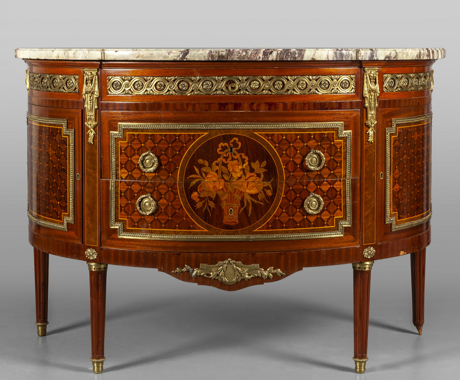 Comò a demi lune finemente lastronato ed intarsiato in palissandro e legni vari con al centro vaso di fiori, ricca decorazione in bronzo dorato, piano in marmo, Francia sec.XIX