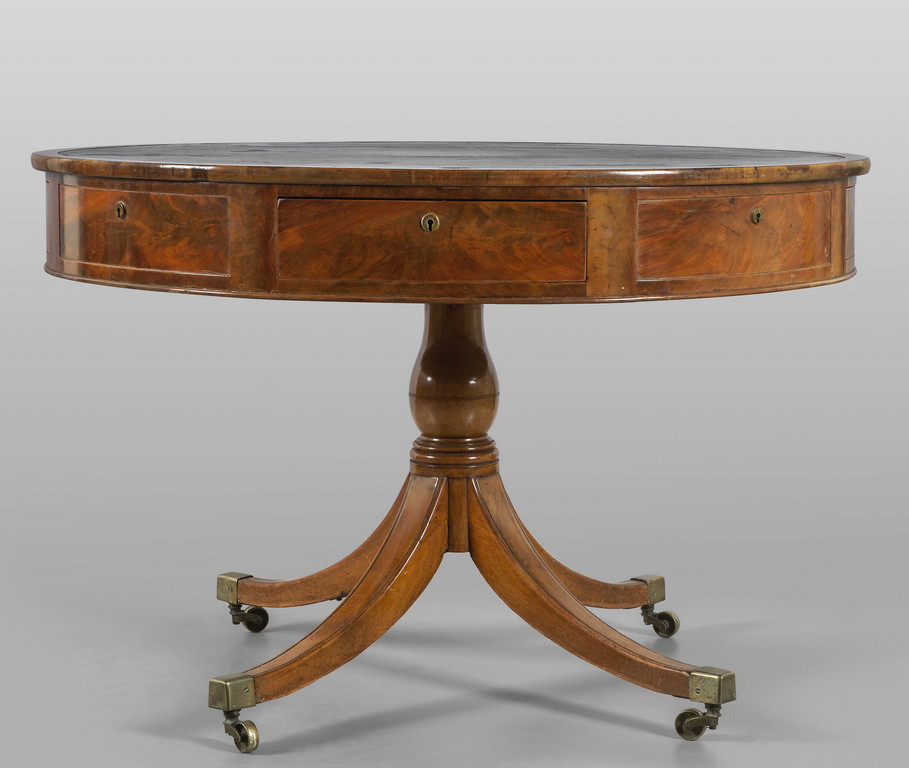Tavolo da biblioteca di forma rotonda lastronato in mogano, piede centrale, piano in pelle, quattro cassetti nella fascia, Inghilterra sec.XIX