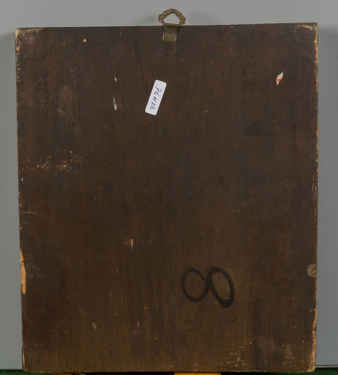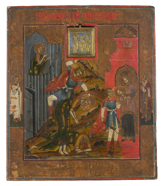 Scuola russa sec. XIX "Il sacrificio di un Santo" icona a tempera su tavola con placchetta in bronzo
