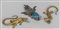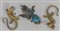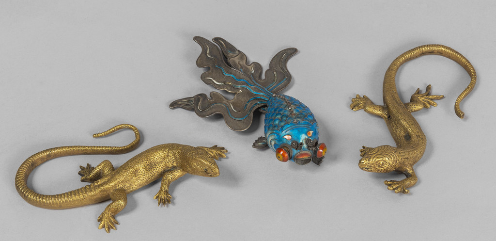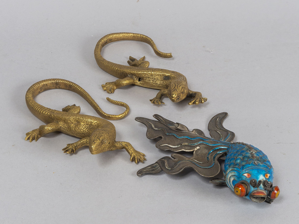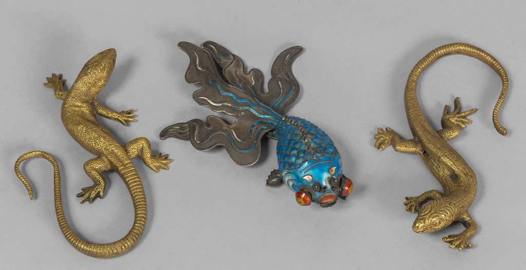 Lotto composto da due lucertole in bronzo dorato e un pesce in argento smaltato