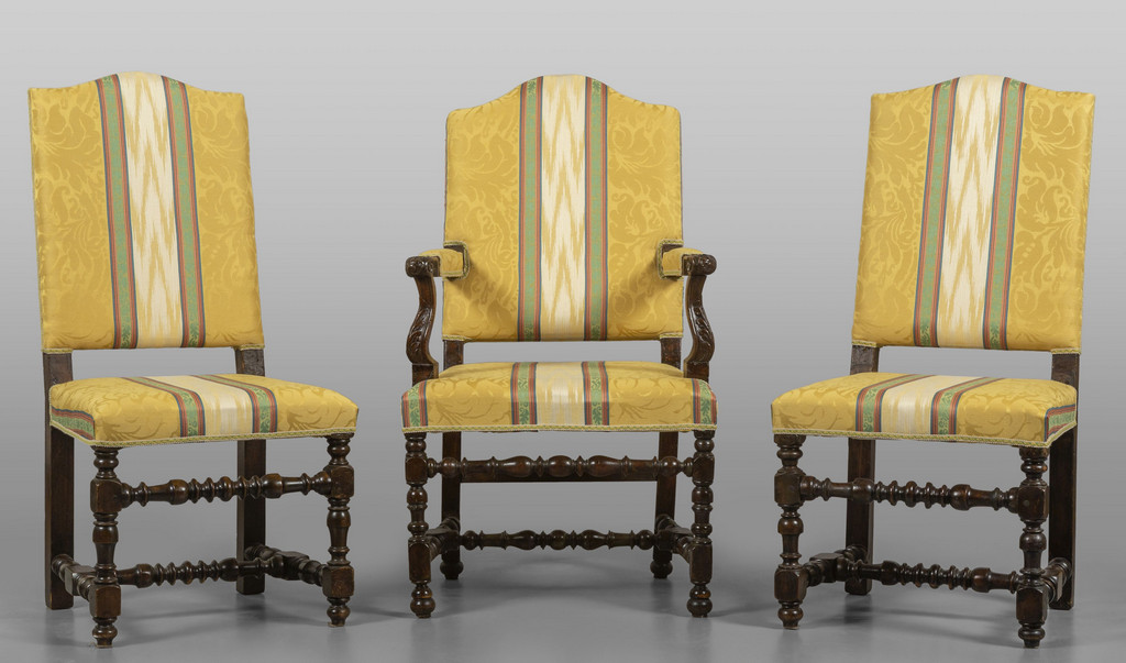 Poltrona e due sedie Luigi XIV in noce a rocchetto, inizi sec.XVIII