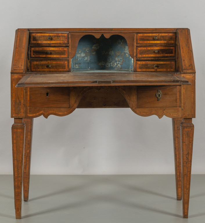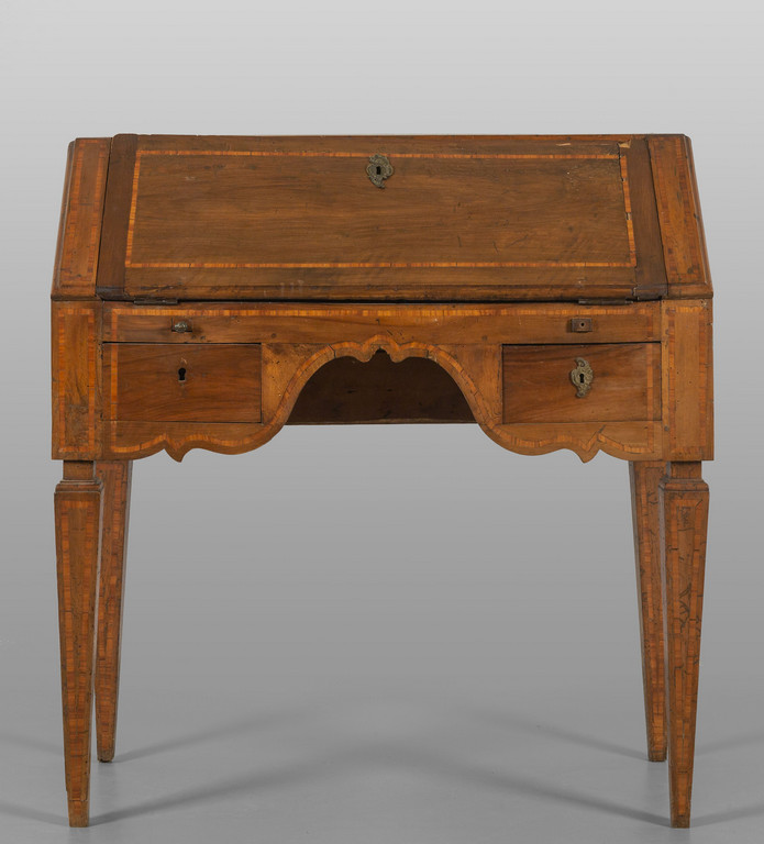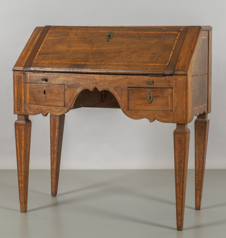 Ribaltina Luigi XVI in noce a gambe alte filettata in bois de rose, due cassetti sul fronte con calatoia, Genova fine sec.XVIII
