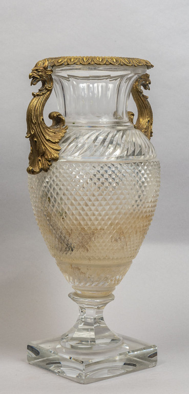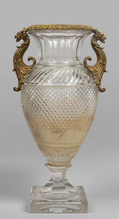 Vaso in cristallo molato con prese in bronzo dorato a forma di drago