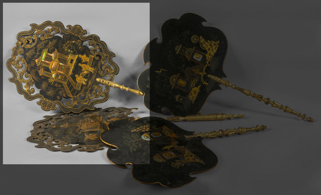 Coppia di ventoline in legno intagliato e dorato con intarsi in madreperla, Venezia sec.XVIII