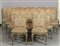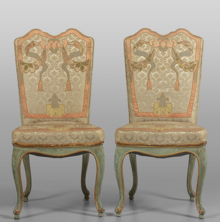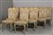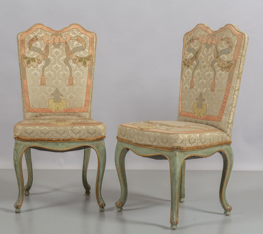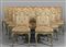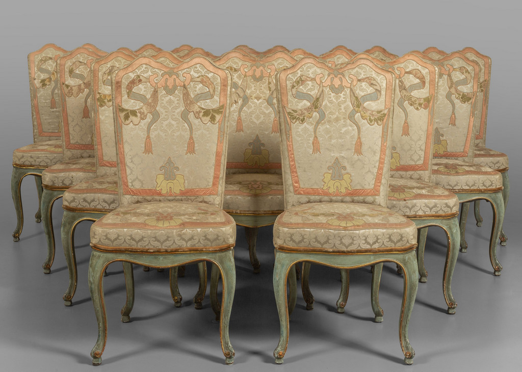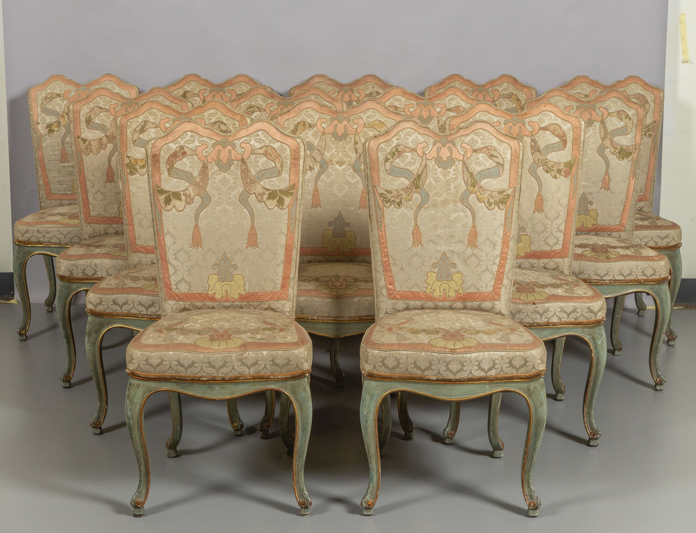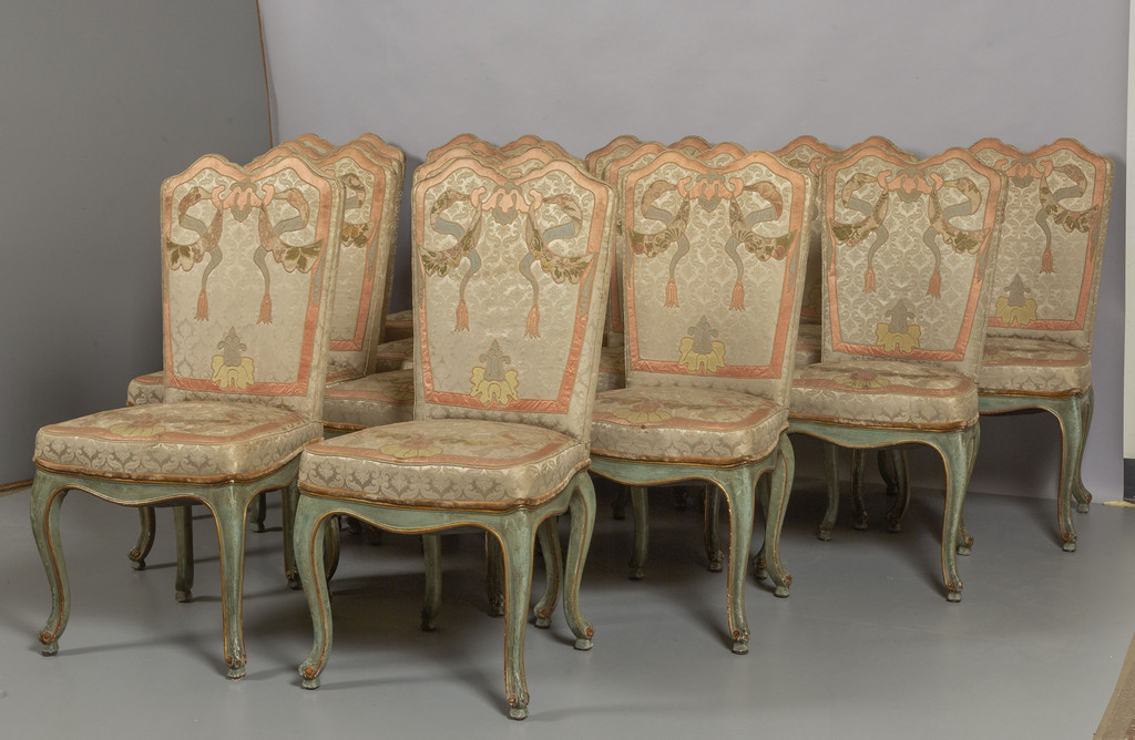 Quattordici sedie in stile antico in legno laccato con profili dorati, bella tappezzeria in damasco di seta con riporti