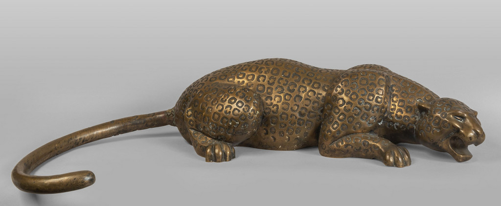 Pantera accovacciata, scultura in bronzo dorata f.ta Arena, inizi sec.XX