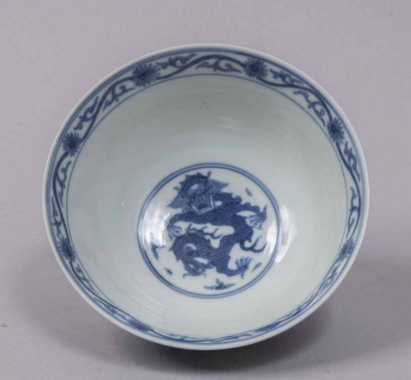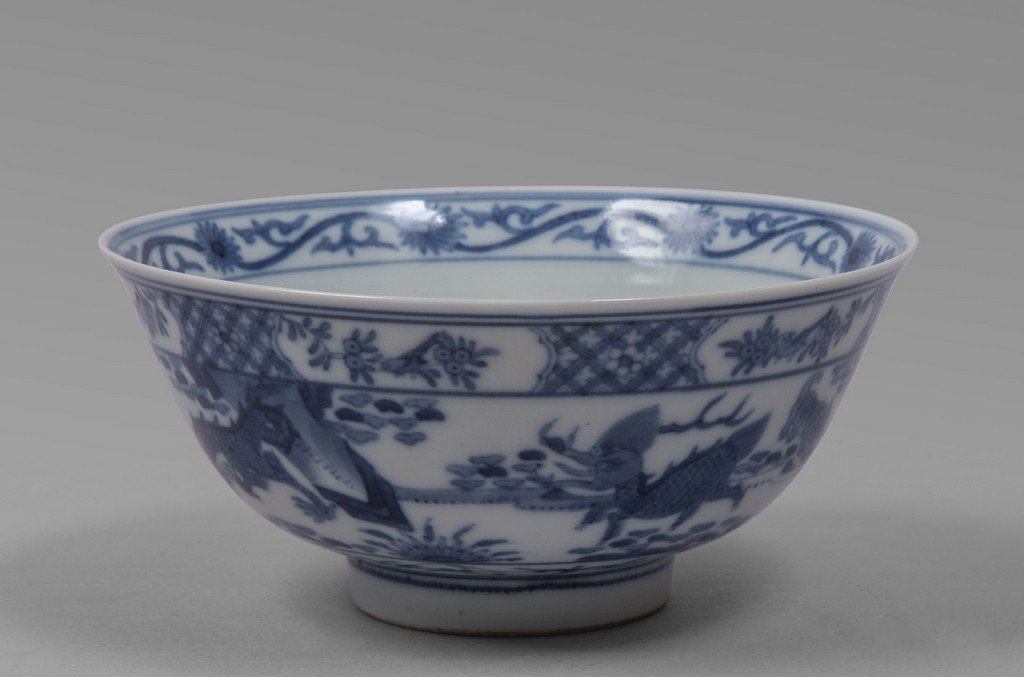 Coppa in porcellana bianca e blu decorata con cervi e dragone, marcata alla base Xanqxi