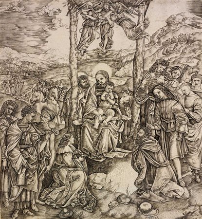 Sono poche le notizie relative alla vita di Cristofano Robetta, nato a Firenze nel 1462, divenuto orafo intorno al 1498 e ancora in vita nel 1535. Si conoscono molte sue incisioni, che trattano i soggetti più svariati, da quelli di carattere religioso fino alle allegorie dell'amore ed ai temi di natura erotica. Questa stampa, per le anatomie delle figure piuttosto incerte, viene considerata opera del periodo iniziale. Essa è un chiaro esempio dell'abilità dell'incisore di riprendere temi da più fonti e riversarli su un'unica lastra. L'idea generale deriva dall'"Adorazione dei Magi" di Filippino Lippi, tavola commissionata dal monastero di S. Donato agli Scoperti. L'incisione è in controparte rispetto alla tavola e si differenzia soltanto per il paesaggio sullo sfondo che Bellini (1973, p. 35) considera derivato dall'"Adorazione dei Magi" di Perugino conservata a Verona, mentre Levenson (in Levenson J.A./ Oberhuber K./ Sheenan J.L., 1973, p. 296 n. 118) vi scorge l'influsso di Dürer per la presenza degli angeli che cantano al di sopra della Sacra Famiglia è evidente l'influsso di Schongauer nel cappello sopra la firma che ritorna identico nella sua "Adorazione dei Magi".