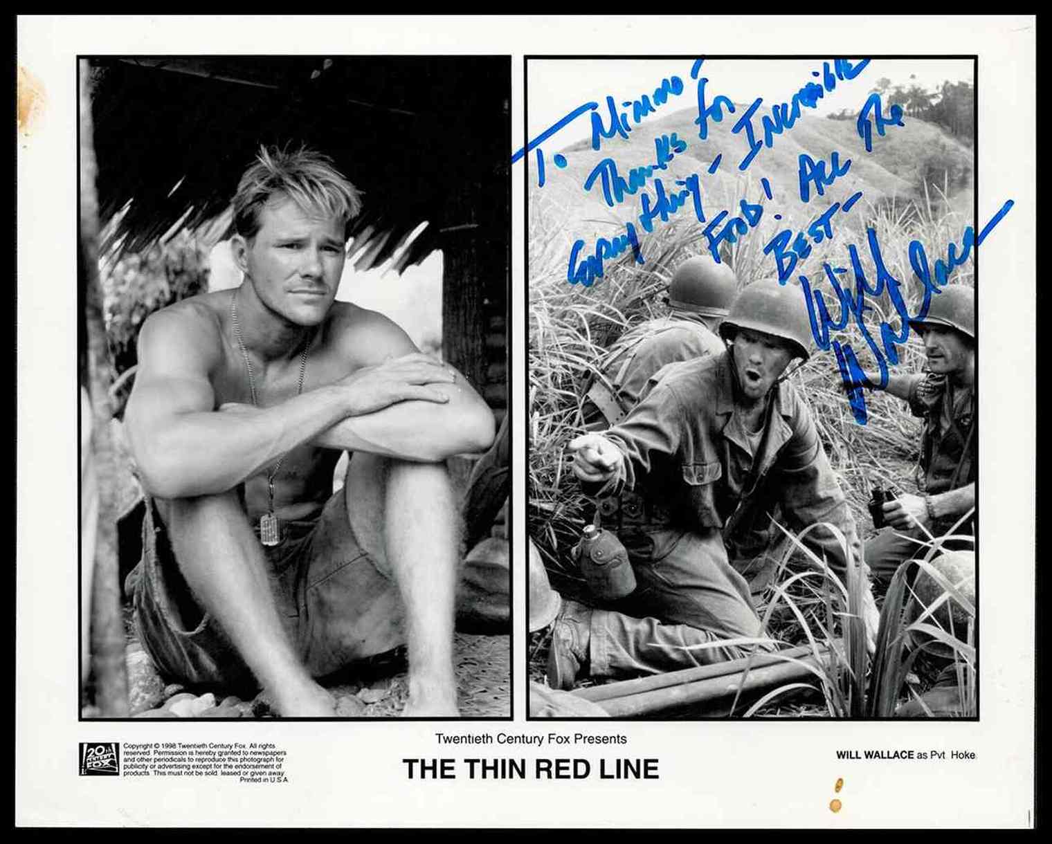 Foto di produzione per la propaganda del film "The Thin Red Line" del 1998 diretto da Terrence Malick con attori come Sean Penn, Nick Nolte, John Travolta. Con dedica e firma di Will Wallace fotografo di scena, a Mimmo della Taverna Flavia