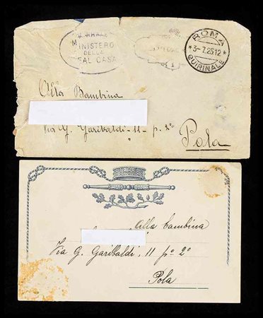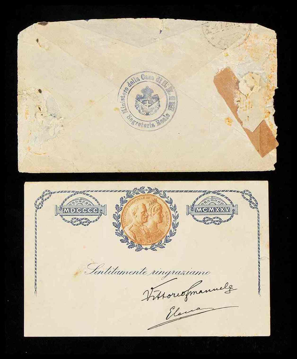 Biglietto di ringraziamento per il 25mo anniversario di Nozze tra il Re Vittorio Emanuele III e la Regina Elena, celebrato nel 1925. Il biglietto è autografato di pugno ad inchiostro nero dai due consorti reali, Vittorio Emanuele ed Elena, ed è in busta originale recante il timbro della SEGRETERIA REALE del MINISTERO DELLA CASA DI SUA MAESTA' IL RE. Il biglietto è stato spedito ed è quindi viaggiato, ad una "bambina" di Pola