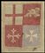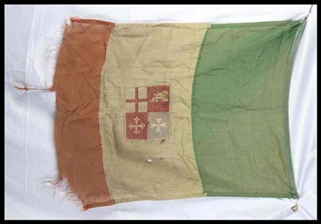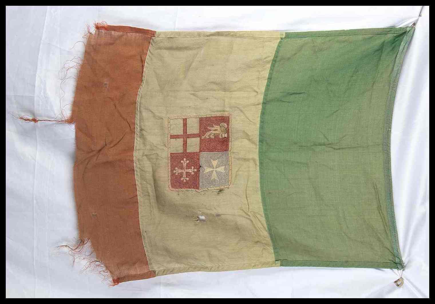 Tricolore italiano, verde bianco e rosso, in cotone cucito, e con ricamato al centro lo stemma della Marina Mercantile, avente le quattro repubbliche marinare di Venezia (PAX TIBI MARCE EVANGELISTA MEVS), Genova, Amalfi e Pisa. Prima metà '900