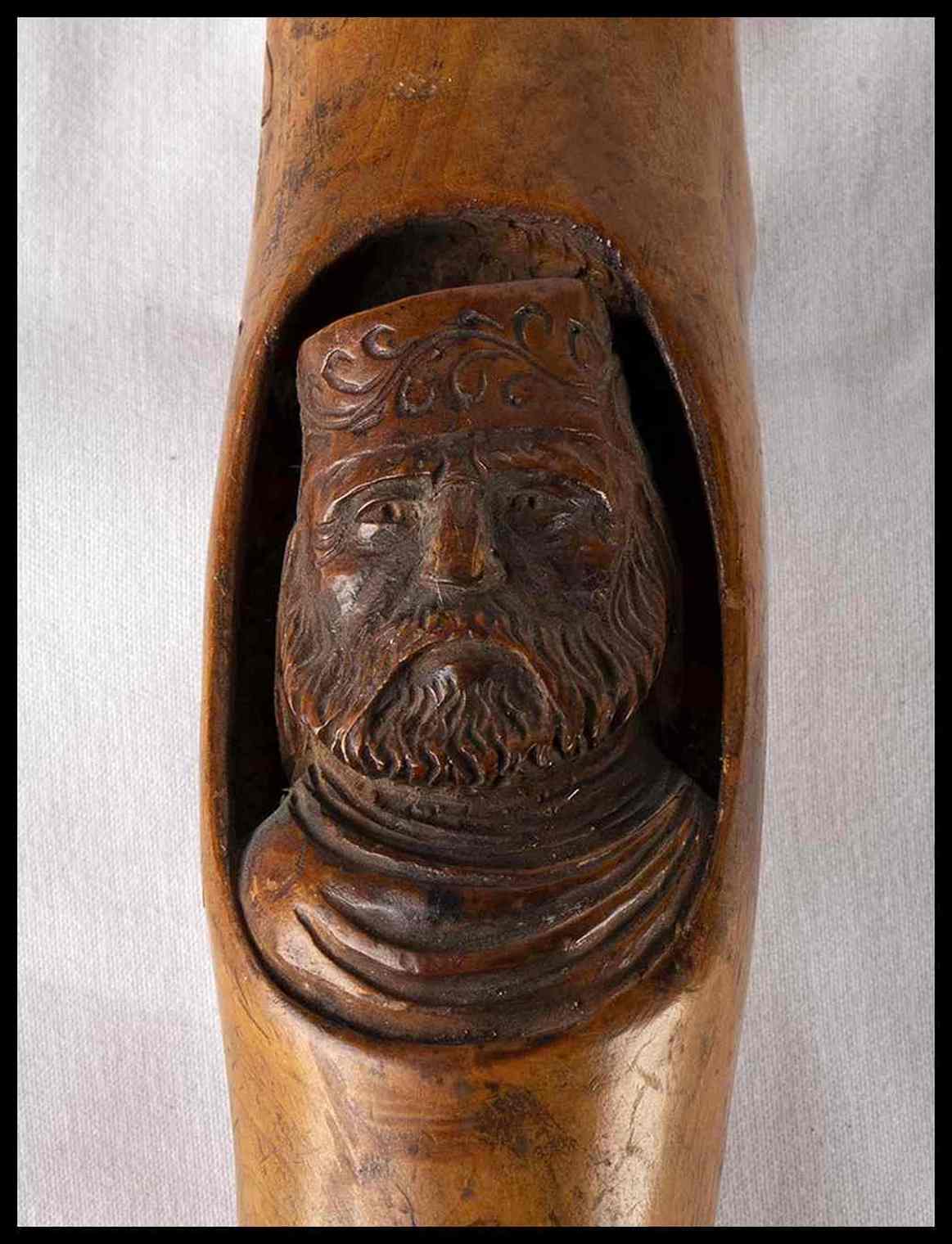 Cimelio ricordo da Caprera, bastone in legno con intagliata l'effige di Garibaldi, Mezzo busto dell'Eroe dei Due Mondi con poncho e berretto ricamato.