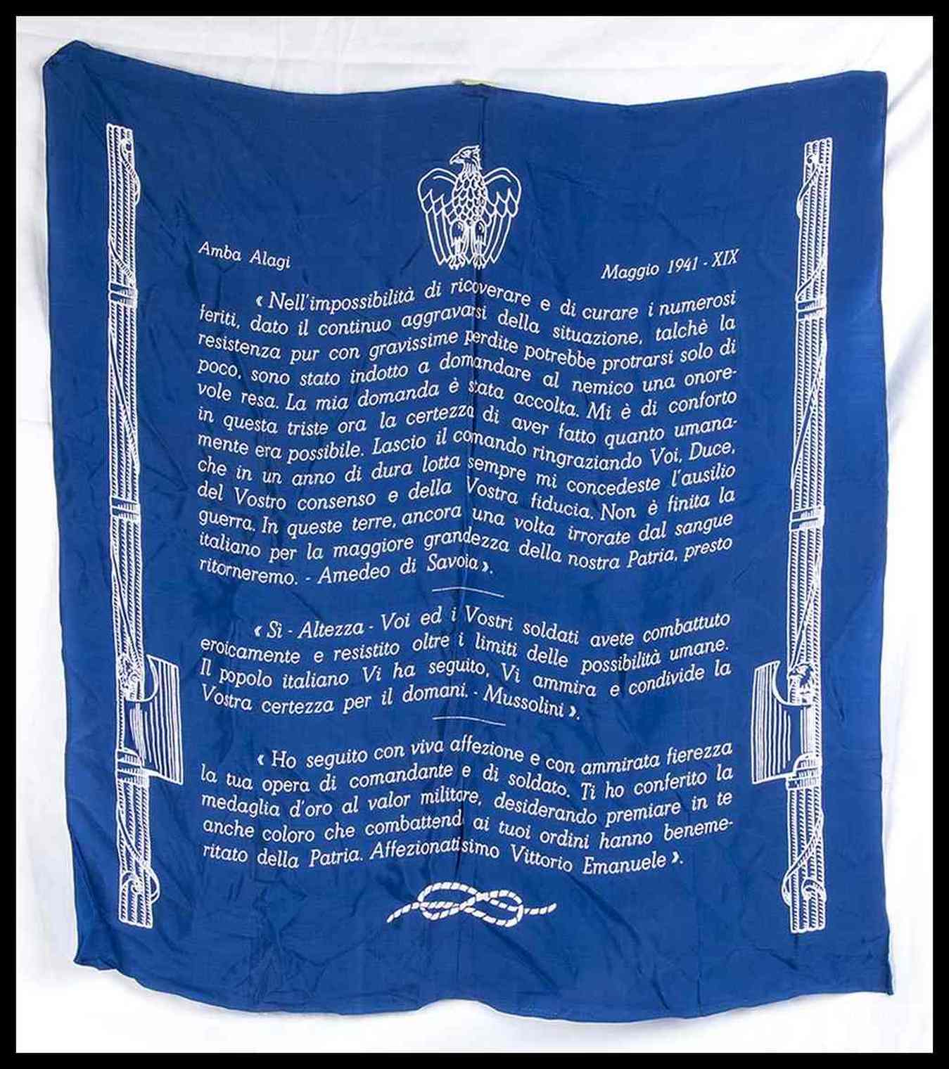 Fazzoletto in seta azzurra, con stampa in colore bianco del discorso della resa del Duca d'Aosta AMEDEO di Savoia all'Amba Alagi, nel Maggio del 1941, e le rispettive risposte di encomio da parte di Mussolini e del Re Vittorio Emanuele III