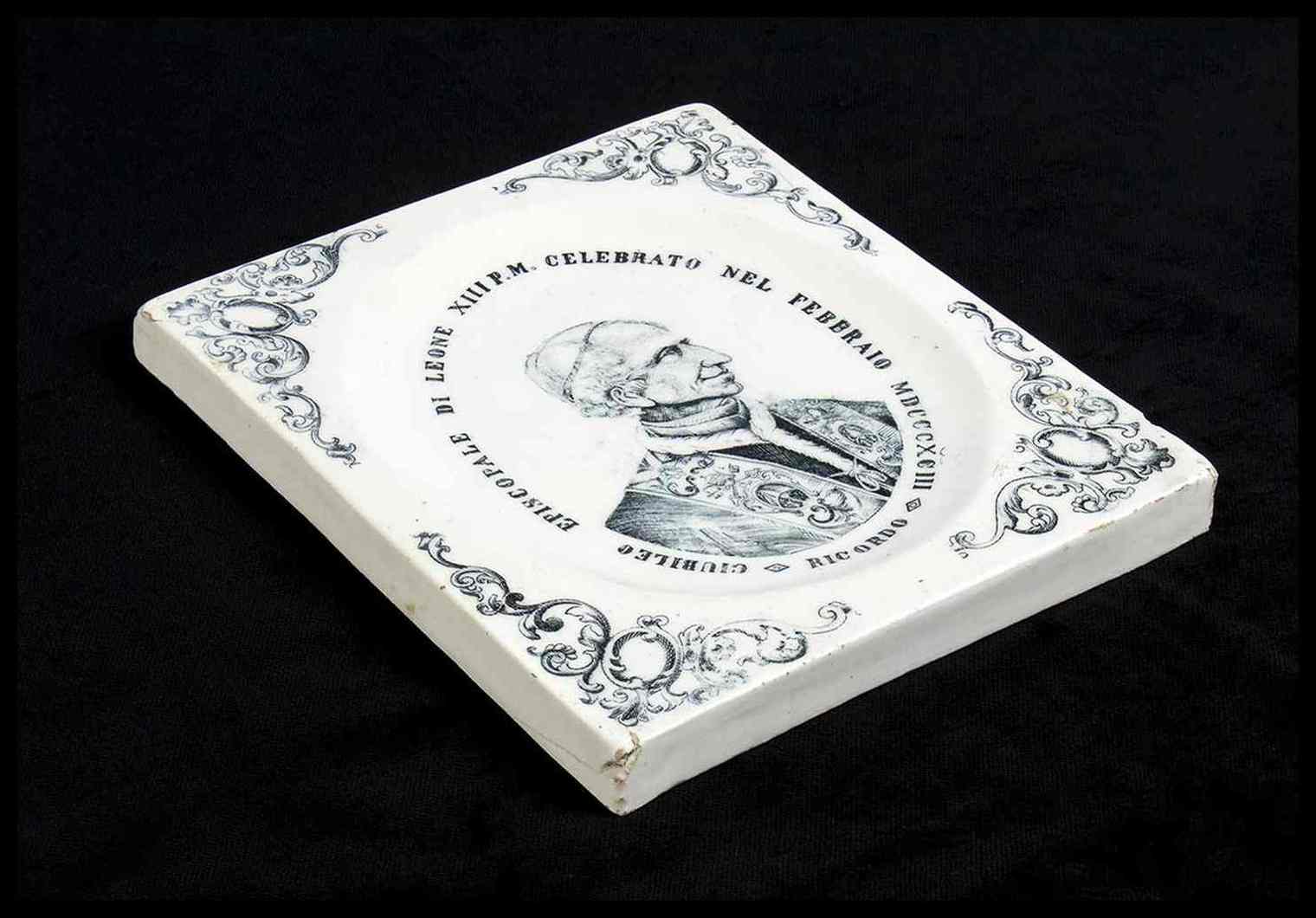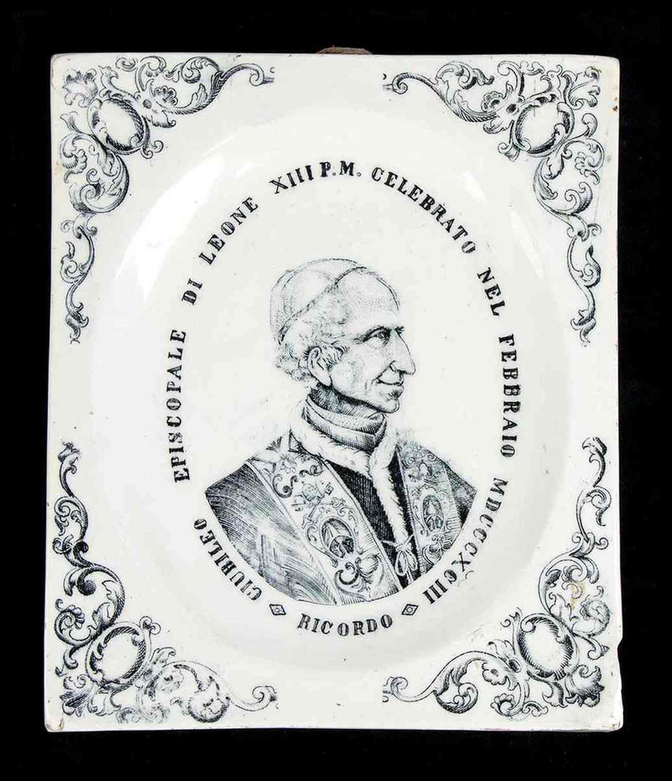 Maiolica in ceramica dipinta, non firmata, commemorativa per RICORDO - GIUBILEO EPISCOPALE DI LEONE XIII P.M. - CELEBRATO NEL FEBBRAIO MDCCCXCIII (1893). Il Papa LEONE XIII raffigurato di tre quarti in abiti liturgici con zuccotto e mozzetta, ai quattro angoli della maiolica disegni floreali. Realizzata nel 1893