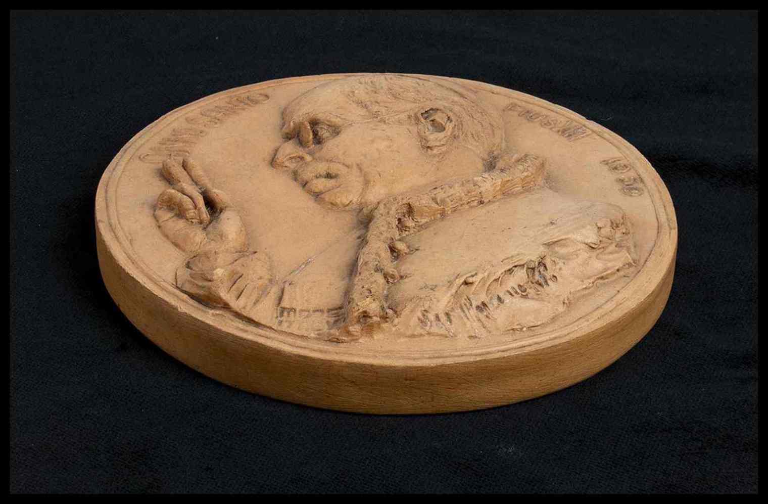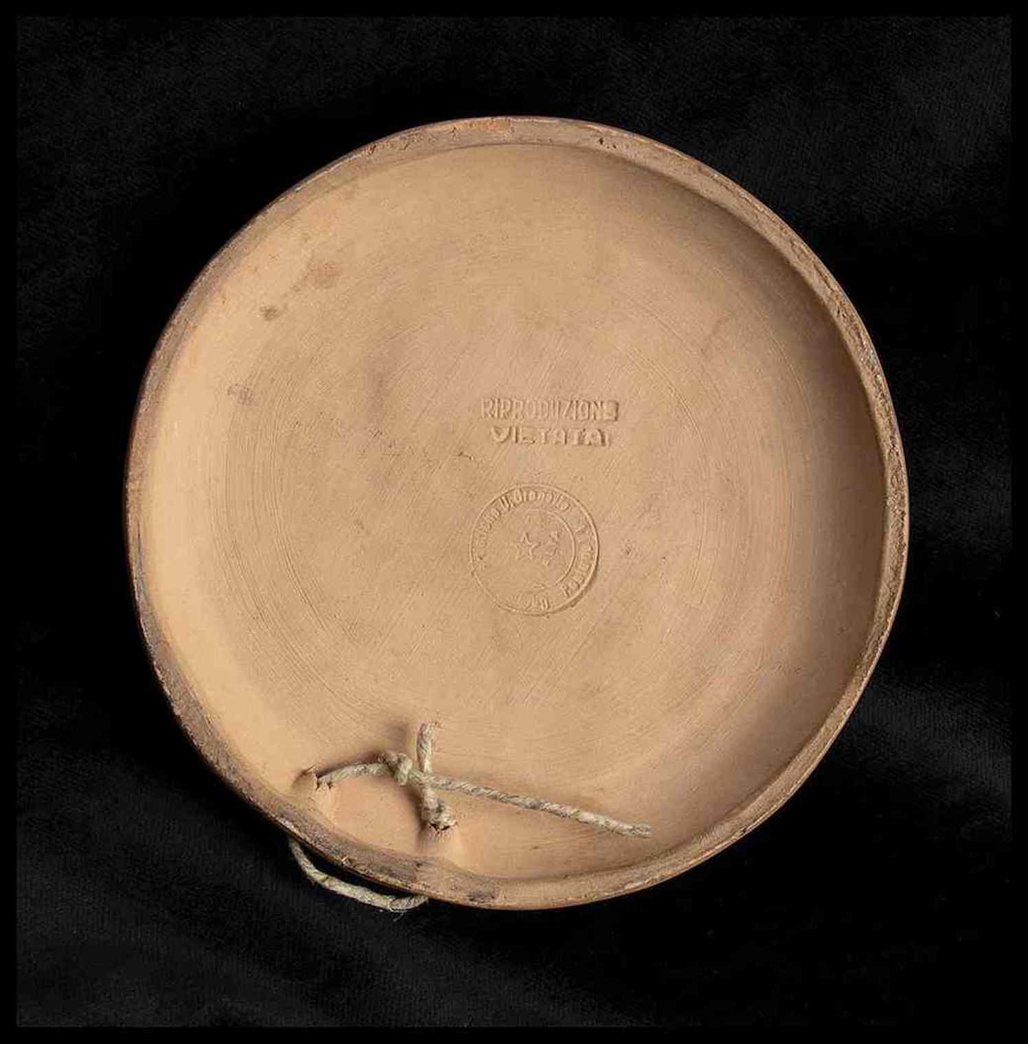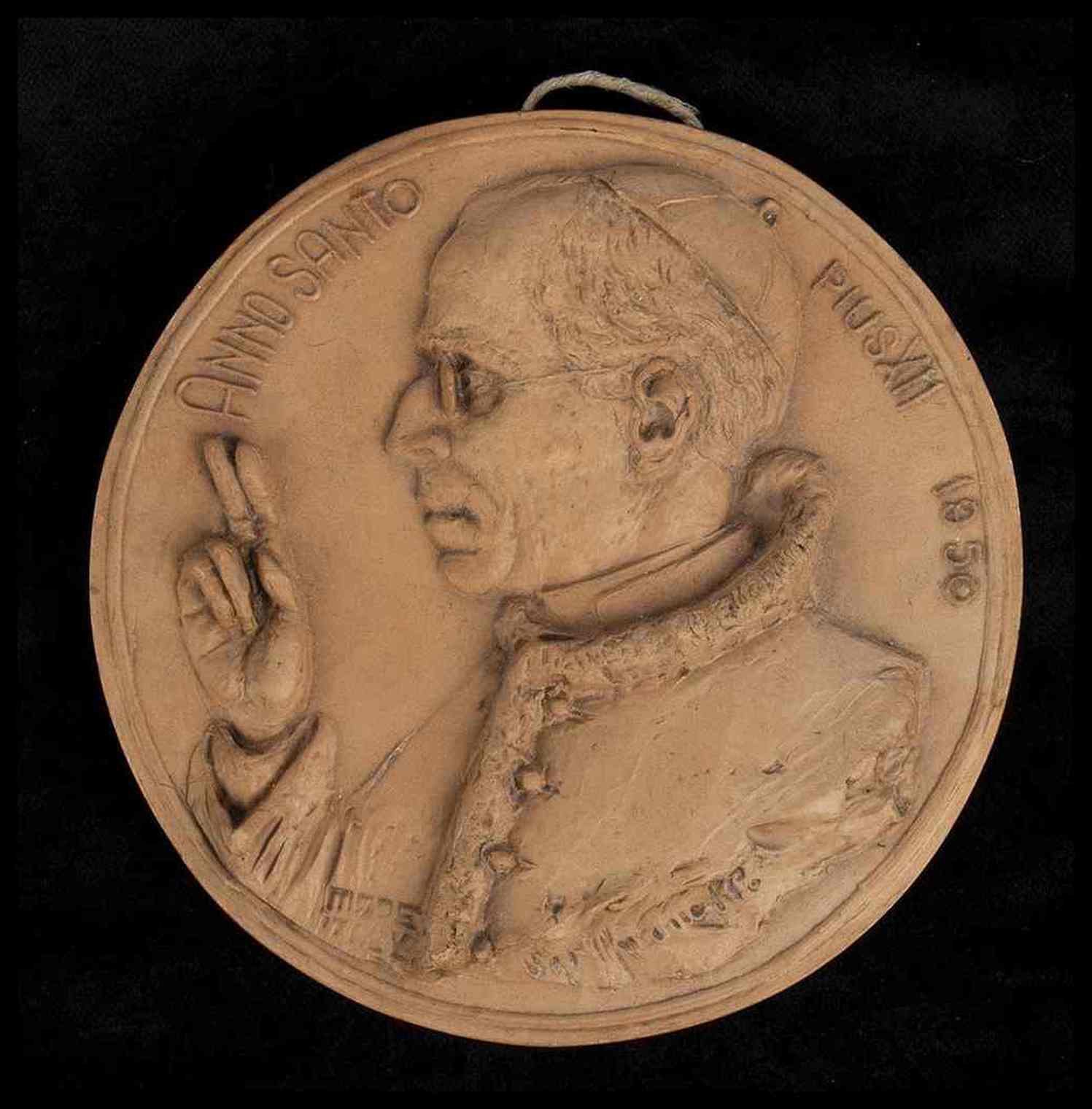 Maiolica tonda in terracotta raffigurante Papa PIO XII benedicente, in mozzetta e zuccotto, commemorativa dello ANNO SANTO 1950 . Firmata Ugo Granello. Marchio Ceramiche Artistiche U.Granello al retro, Riproduzione Vietata