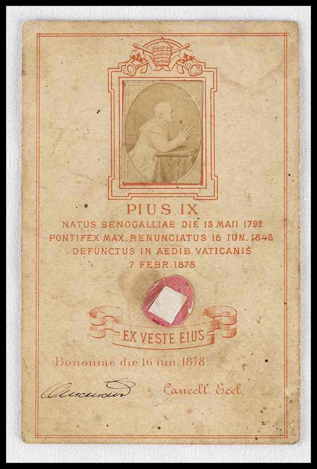 PIO IX (Pius PP. IX, nato Giovanni Maria Battista Pietro Pellegrino Isidoro Mastai-Ferretti; Senigallia, 13 maggio 1792 – Roma, 7 febbraio 1878) Reliquia, cimelio
