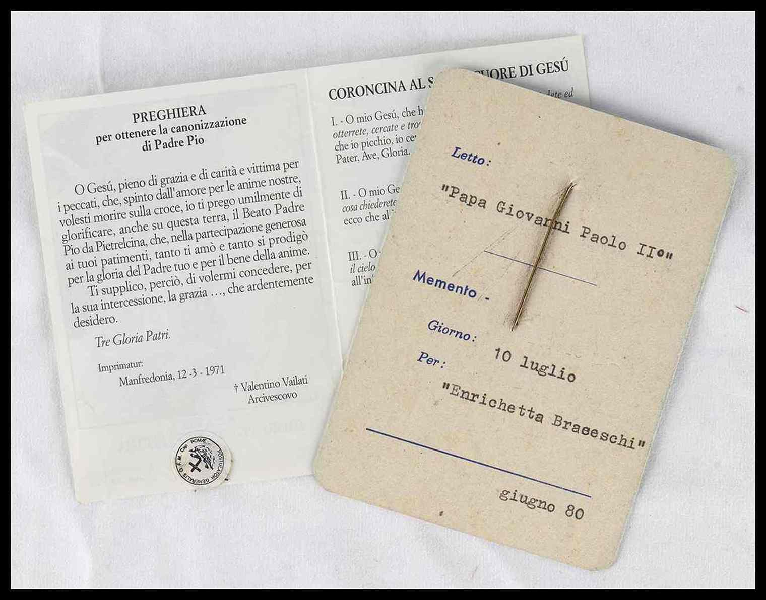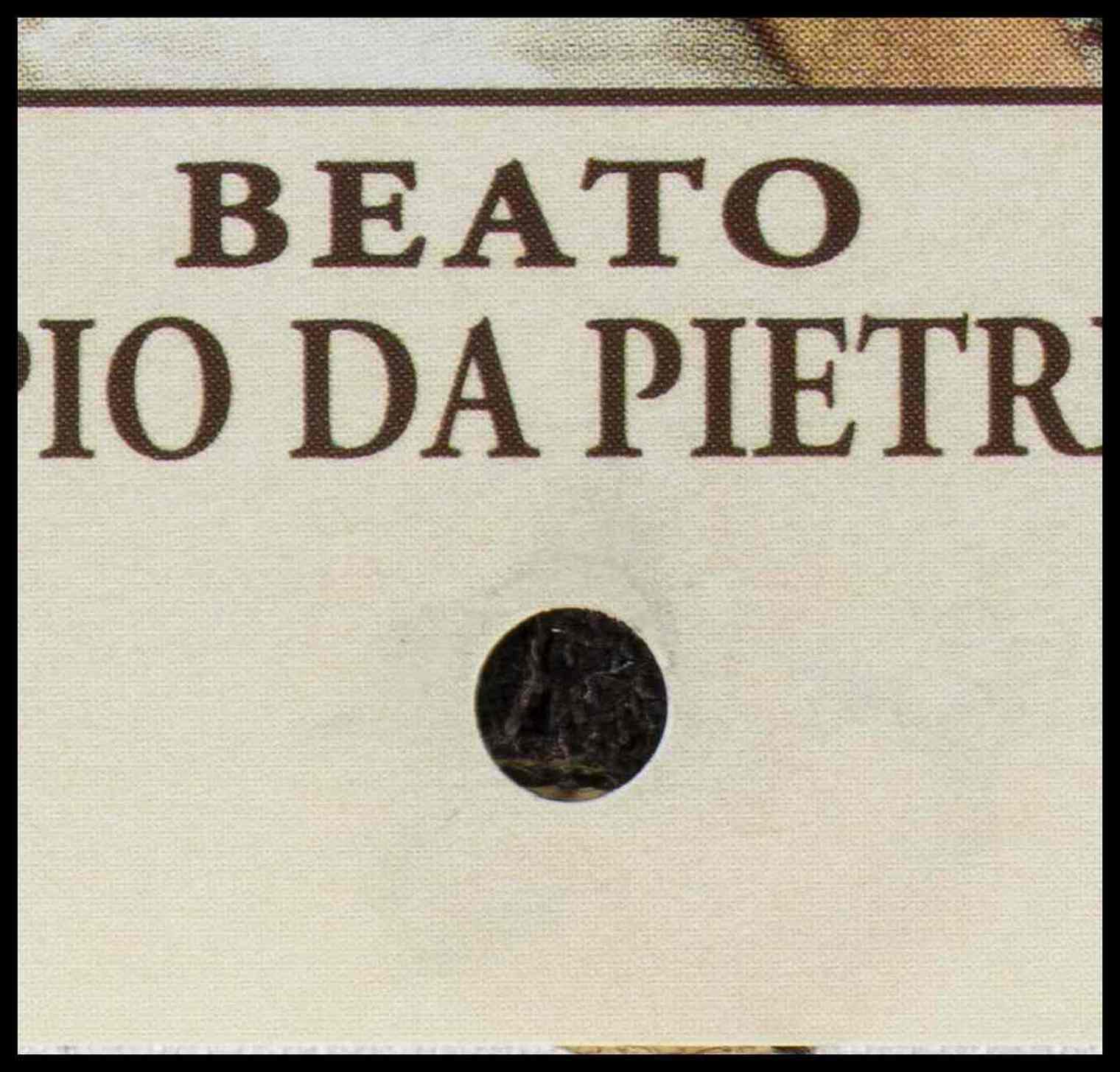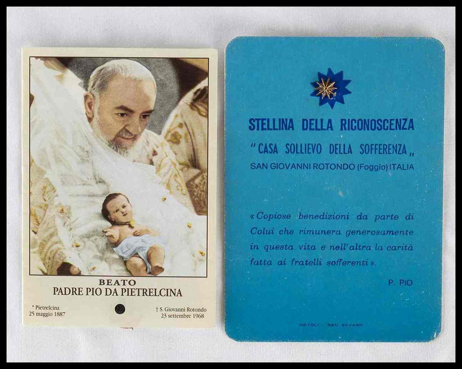 Lotto di due reliquie : cartoncino con immagine fotografica di BEATO PADRE PIO DA PIETRELCINA con piccolo frammento in cotone marrone di veste francescana, protetto da sigillo Postulator Generalis O.F.M. Cap Romae DA PIETRELCINA ; cartoncino con STELLINA DELLA RICONOSCENZA da Casa Sollievo Della Sofferenza di San Giovanni Rotondo, opera di Padre Pio.