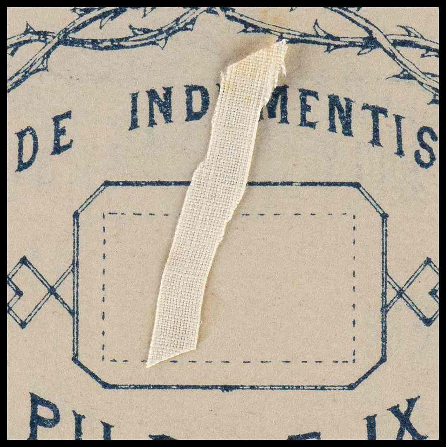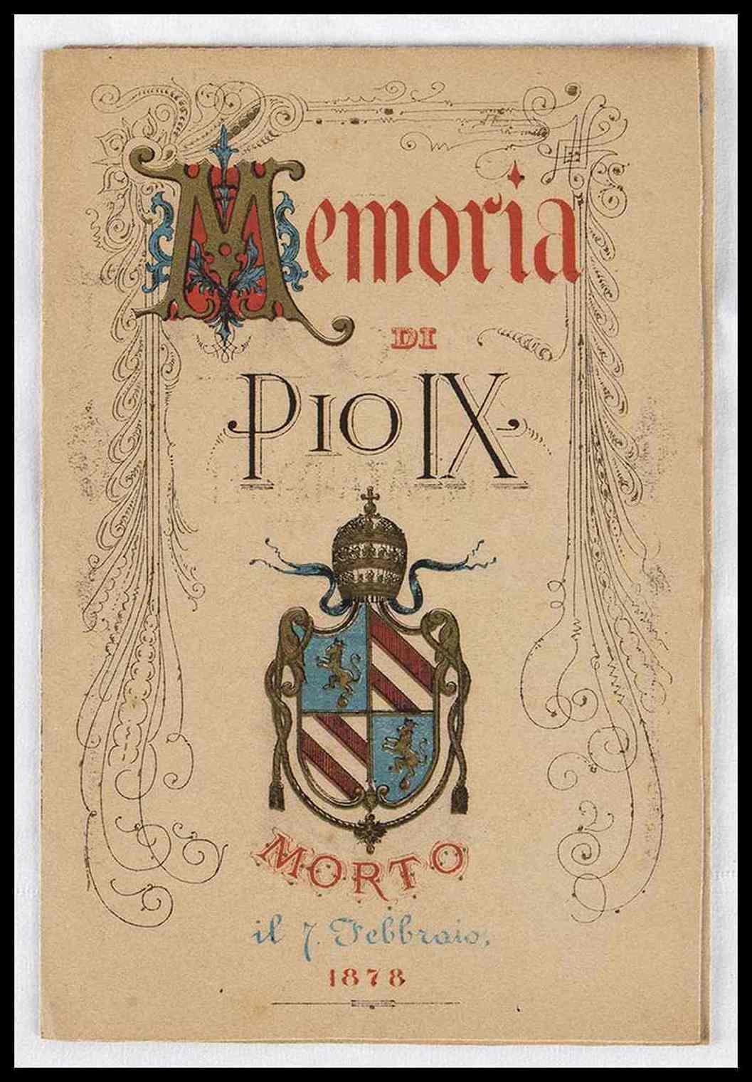 Cartoncino in MEMORIA DI PIO IX MORTO il 7 FEBBRAIO 1878 , apribile in tre sezioni, con parte centrale avente piccolo frammento di indumento in cotone bianco, applicato entro cornicetta DE INDUMETIS PII PAPAE IX - Orazione Funebre di Pio IX Recitata Nella Cappella Sistina da Mons. Mercurelli il 16 Febbraio 1878