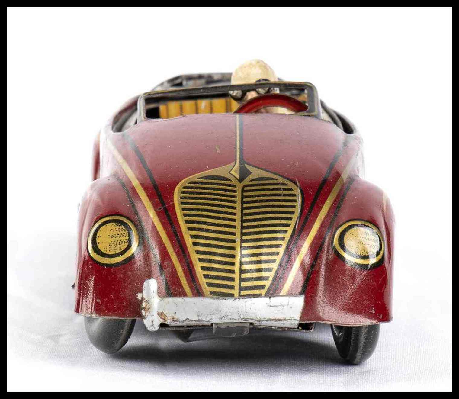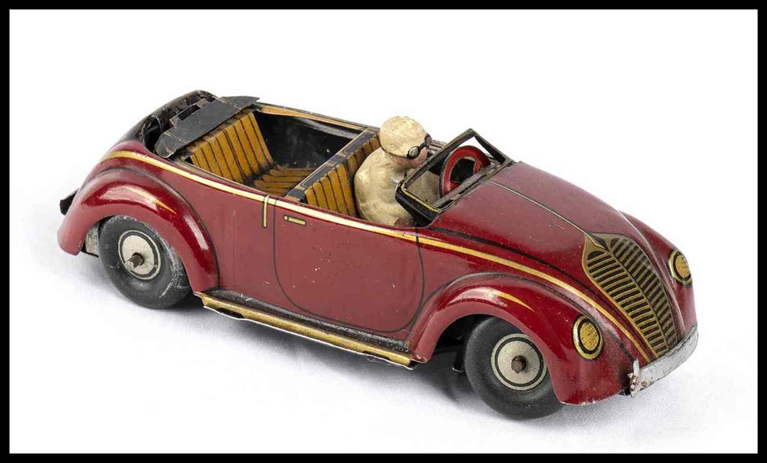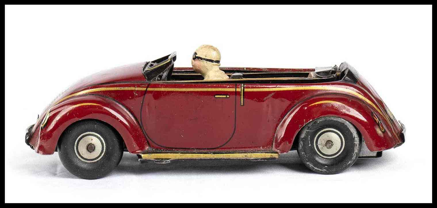 Automedello giocattolo prodotto dalla Kellerman CKO, made in Germany, DRGM, 1930s. In latta litografata, movimento con carica a molla, e con meccanismo di ribaltamento del tettino per trasformare il modello in versione cabriolet oppure in versione chiusa. Con pilota originale, targa litografata K-358