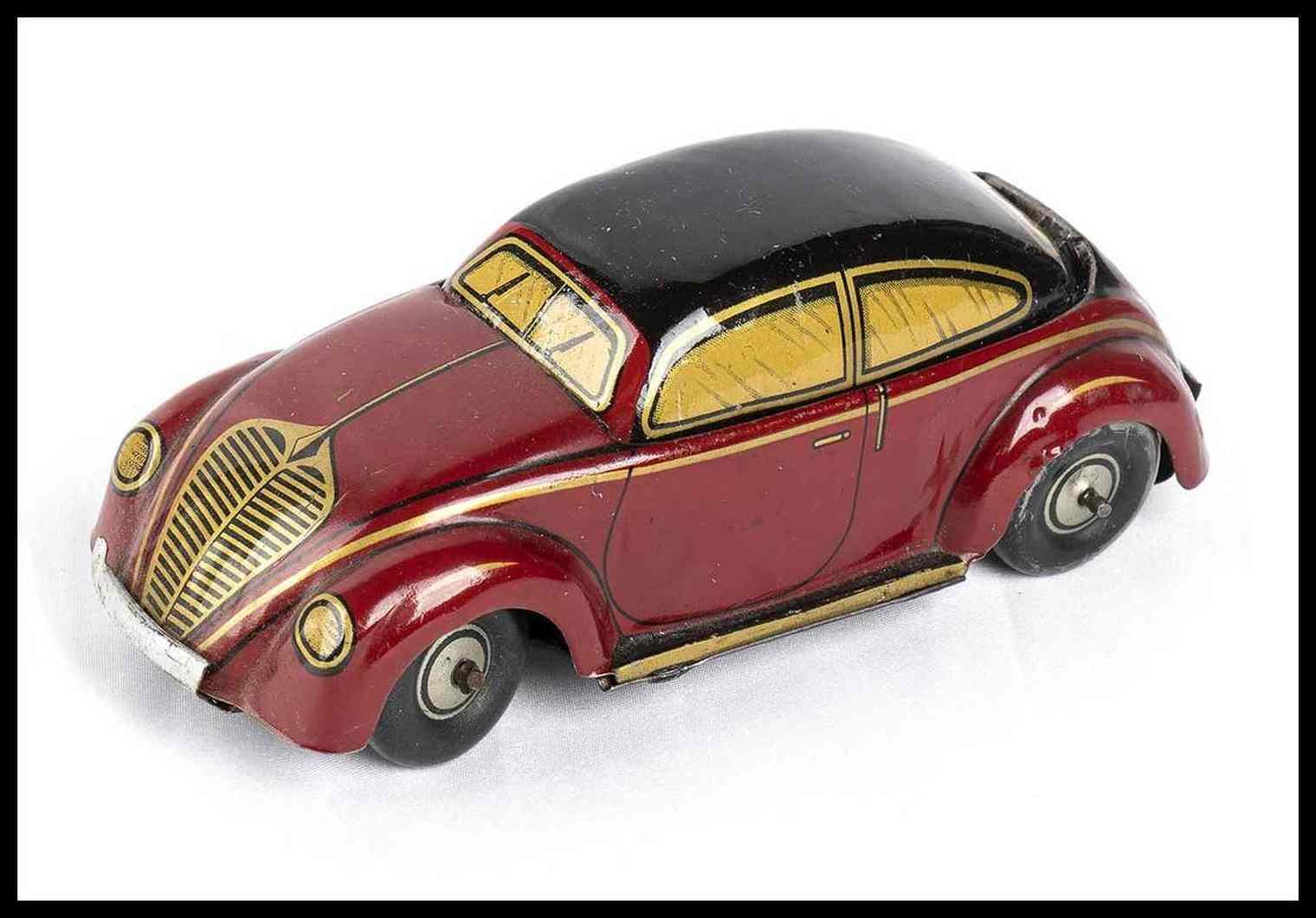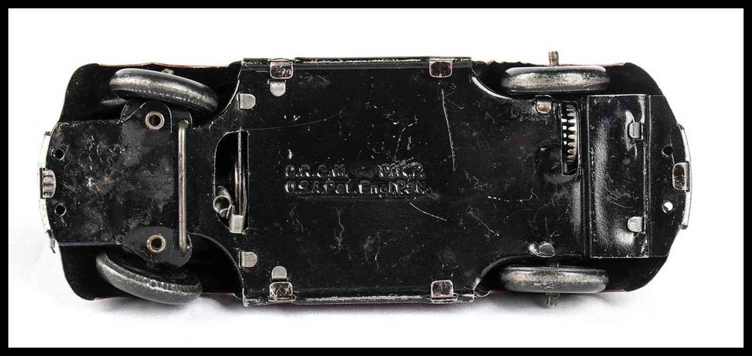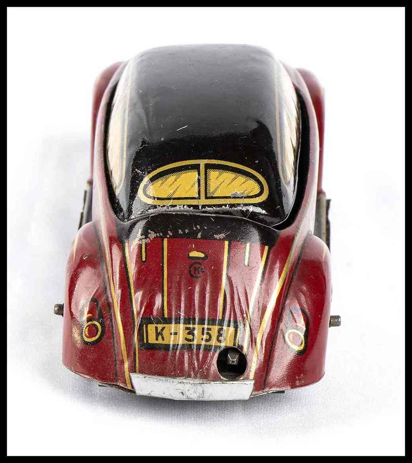 Automedello giocattolo prodotto dalla Kellerman CKO, made in Germany, DRGM, 1930s. In latta litografata, movimento con carica a molla, e con meccanismo di ribaltamento del tettino per trasformare il modello in versione cabriolet oppure in versione chiusa. Con pilota originale, targa litografata K-358