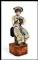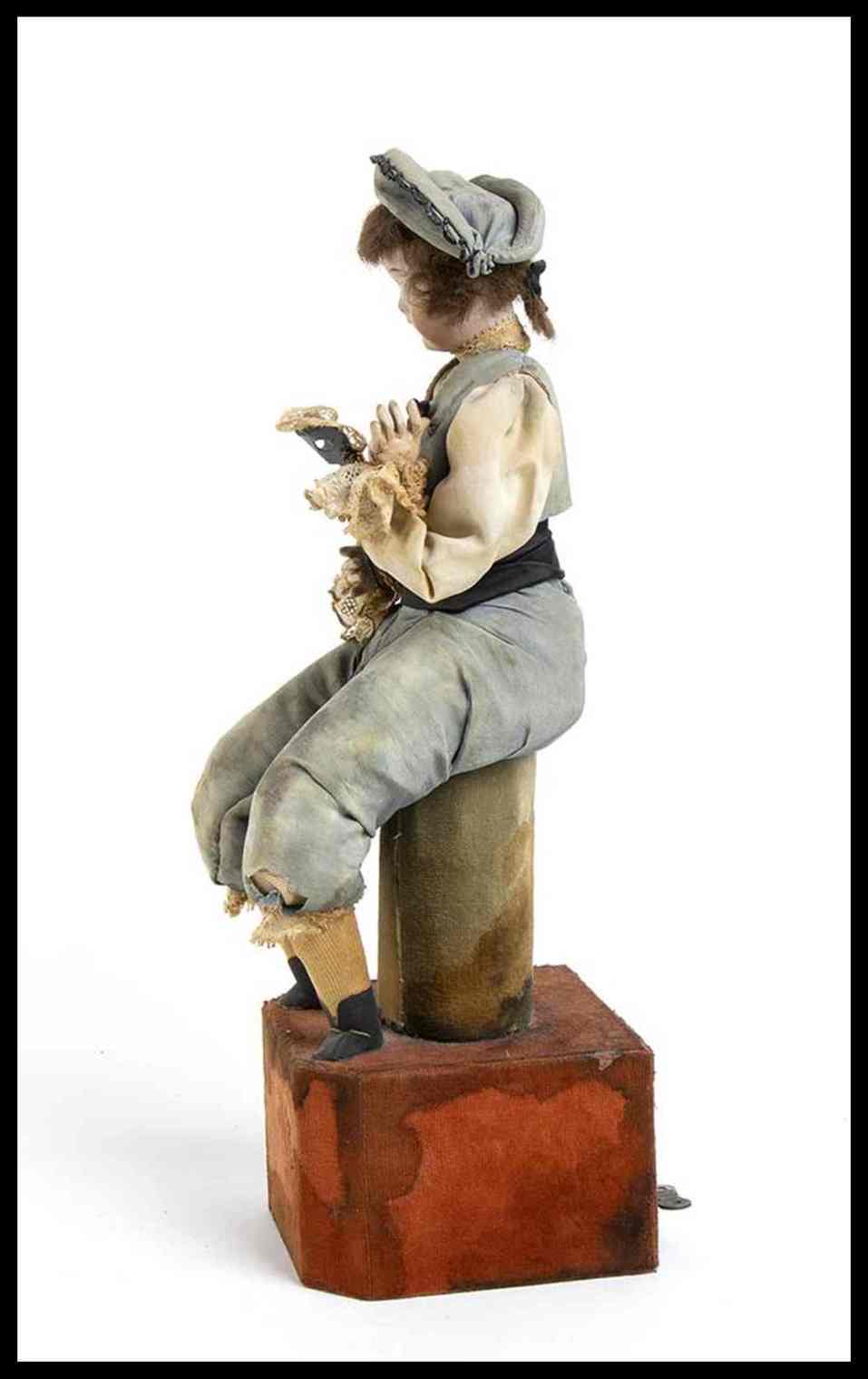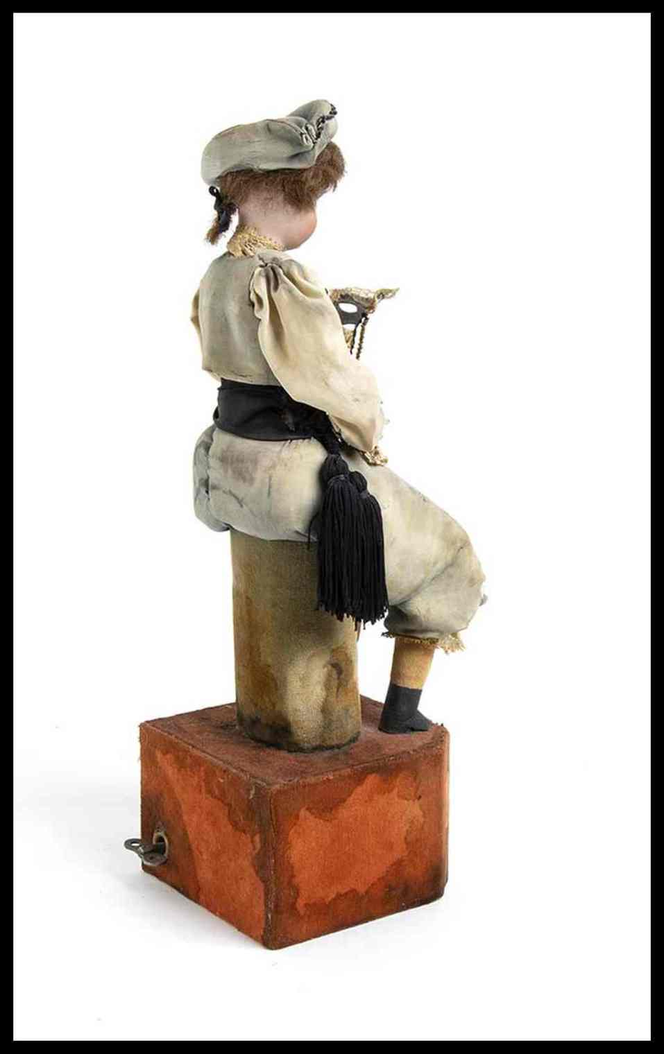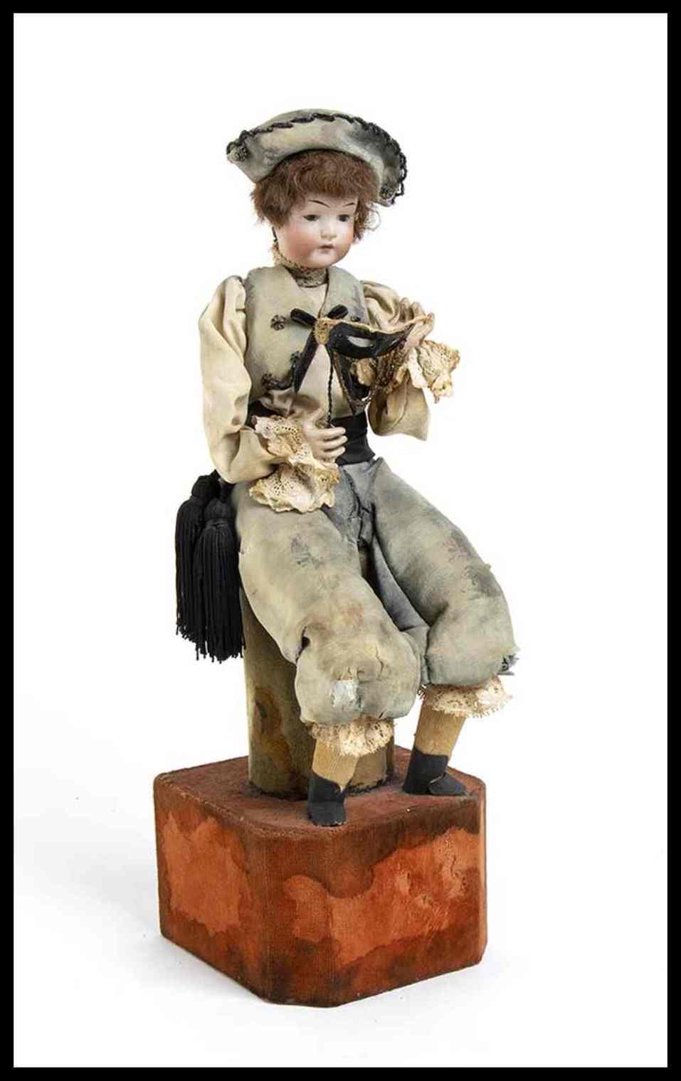 Bambola automa meccanica, fine '800. Con testa in biscuit, marcata HEUBACH KOPPELSDORF - 407.15 / 6 - GERMANY , bocca aperta, parrucca di capelli veri, corpo con arti in pasta di legno, vestito in stoffa,seta,velluto e merletto, con cappellino in testa. Alla mano destra tiene una maschera per occhi tipo carnevale veneziano. La bambola è seduta su una base in legno, rivestita in velluto, che nasconde il meccanismo ed un carillon, con carica a molla funzionante; azionando la chiave la bambola porta il braccio con la mascherina all'altezza del viso, abbassando e sollevando la testa, ed il carillon suona una musica non meglio identificata