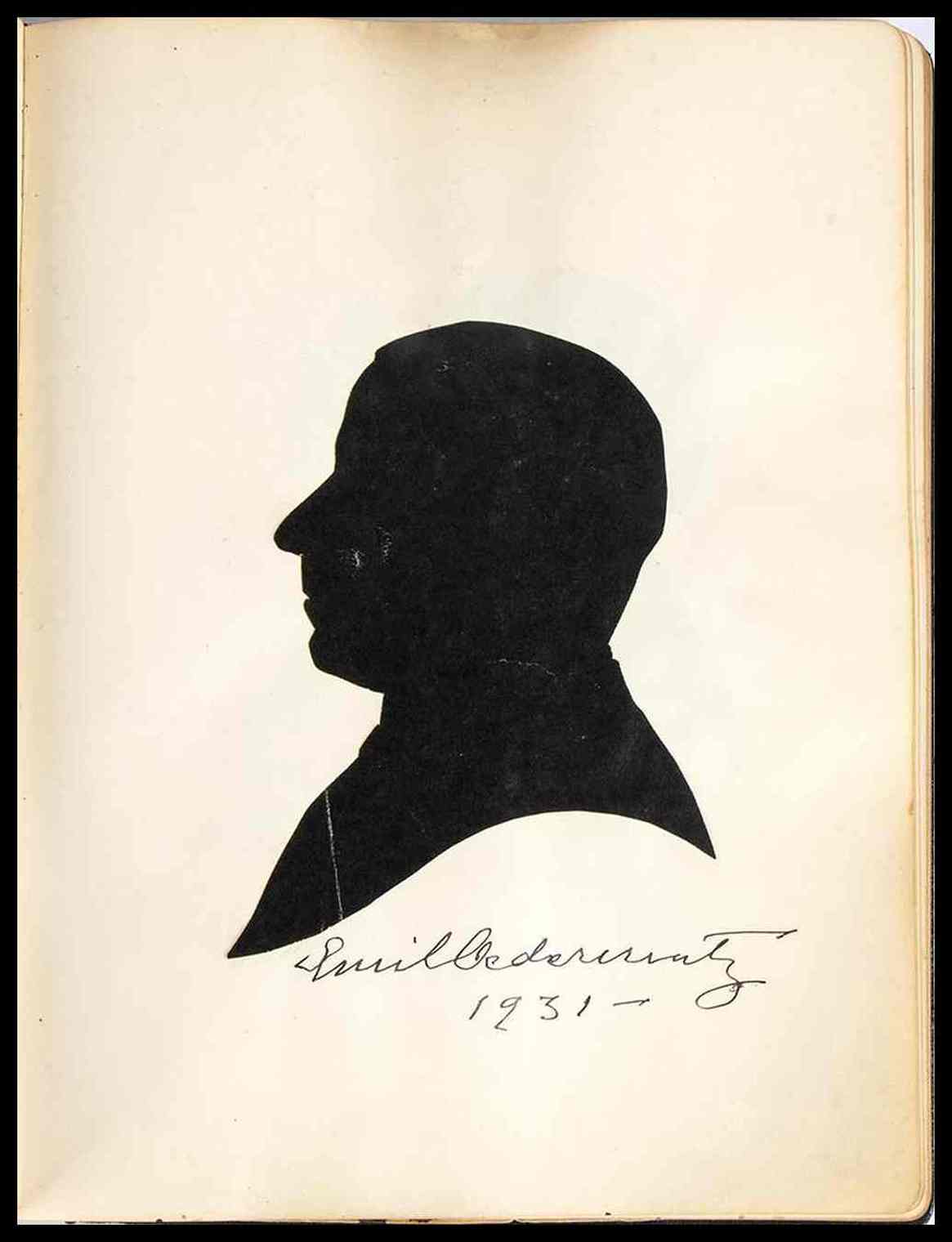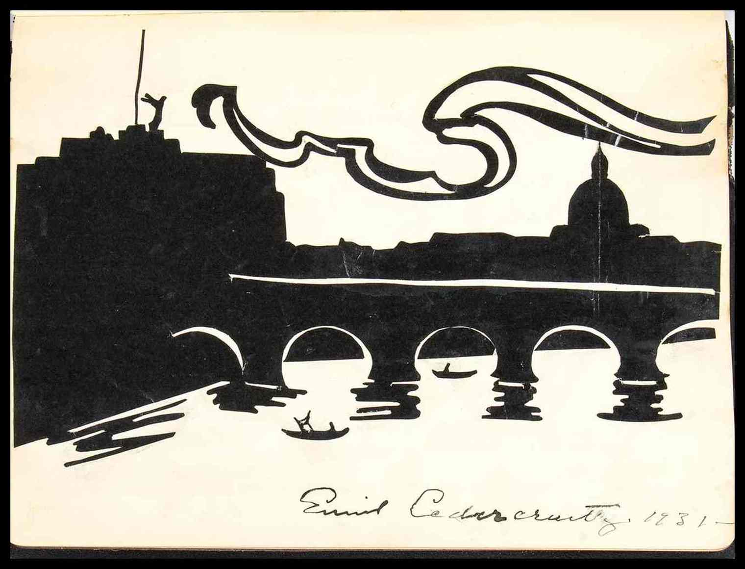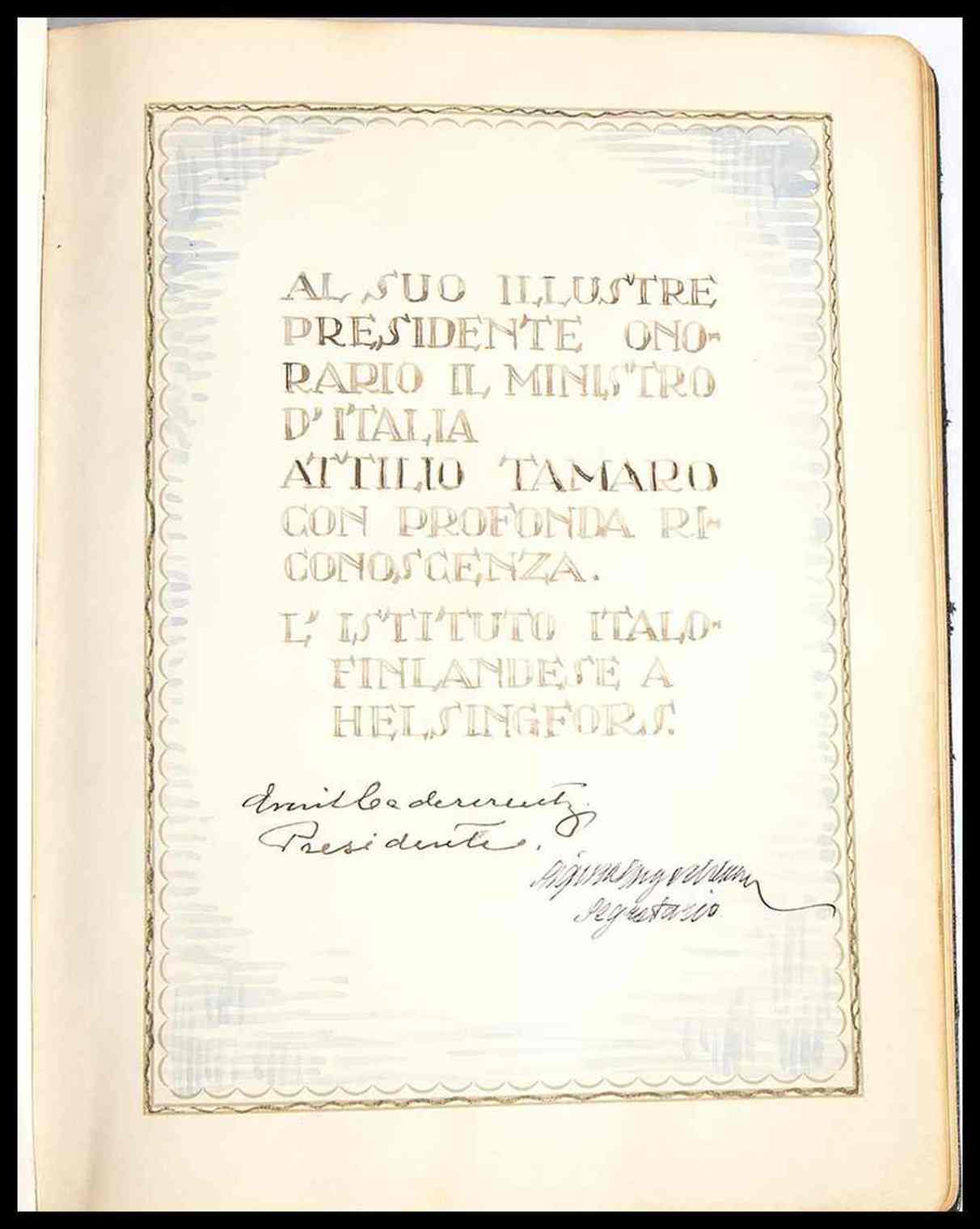 Diario di amicizia dedicato al Ministro italiano Attilio Tamaro, Presidente onorario dell'Istituto Italo Finlandese di Helsingfors (Helsinki) capitale della Finlandia. Il diario è una vera raccolta di opere d'arte originali, realizzate dal maestro Emil Cedercreutz : ci sono 84 silhouettes di personaggi noti dell'epoca, 11 silhouettes di paesaggi ed importanti città italiane come Roma, Venezia, Napoli. Ogni pagina misura cm. 19x24. Copertina in similpelle, con impresse le iniziali A.T. in similoro e la data 23 Aprile 1931. Prima pagina con dedica "Al suo illustre Presidente onorario il ministro d'Italia Attilio Tamaro con profonda riconoscenza. L'Istituto Italo Finlandese a Helsingfors" ed autografo di Emile Cedercreutz in qualità di presidente del suddetto istituto. Le silhouettes sono originali, in carta leggera nera, applicate alle pagine del diario. I ritratti dei personaggi sono accompagnati in calce dalla firma autografa del personaggio ritratto; le raffigurazioni di paesaggi e città sono ancora silhouettes originali e firmate autografe da Emile Cedercrutz stesso. Nel diario sono raccolte circa 193 firme autografe di diplomatici, rappresentanti dell'istituto, degli impiegati, ed amici finlandesi. Cedercreutz riformò la scultura finlandese introducendo i temi del lavoro e della vita quotidiana., i cavalli erano il suo tema più amato. Fu uno dei primi rappresentanti dello stile scultoreo impressionista e realistico in Finlandia.. Nel 1914 Cedercreutz iniziò a lavorare nel suo nuovo atelier sul fiume Kokemäenjoki nel comune di Harjavalta, raccogliendo anche reperti storici dalla campagna della provincia di Satakunta, e nel 1916 fondò un museo ad Harjavalta, oggi noto come Museo Emil Cedercreutz,dove sono esposte collezioni di opere di Cedercreutz, storia culturale, e nel quale si tengono mostre d'arte.