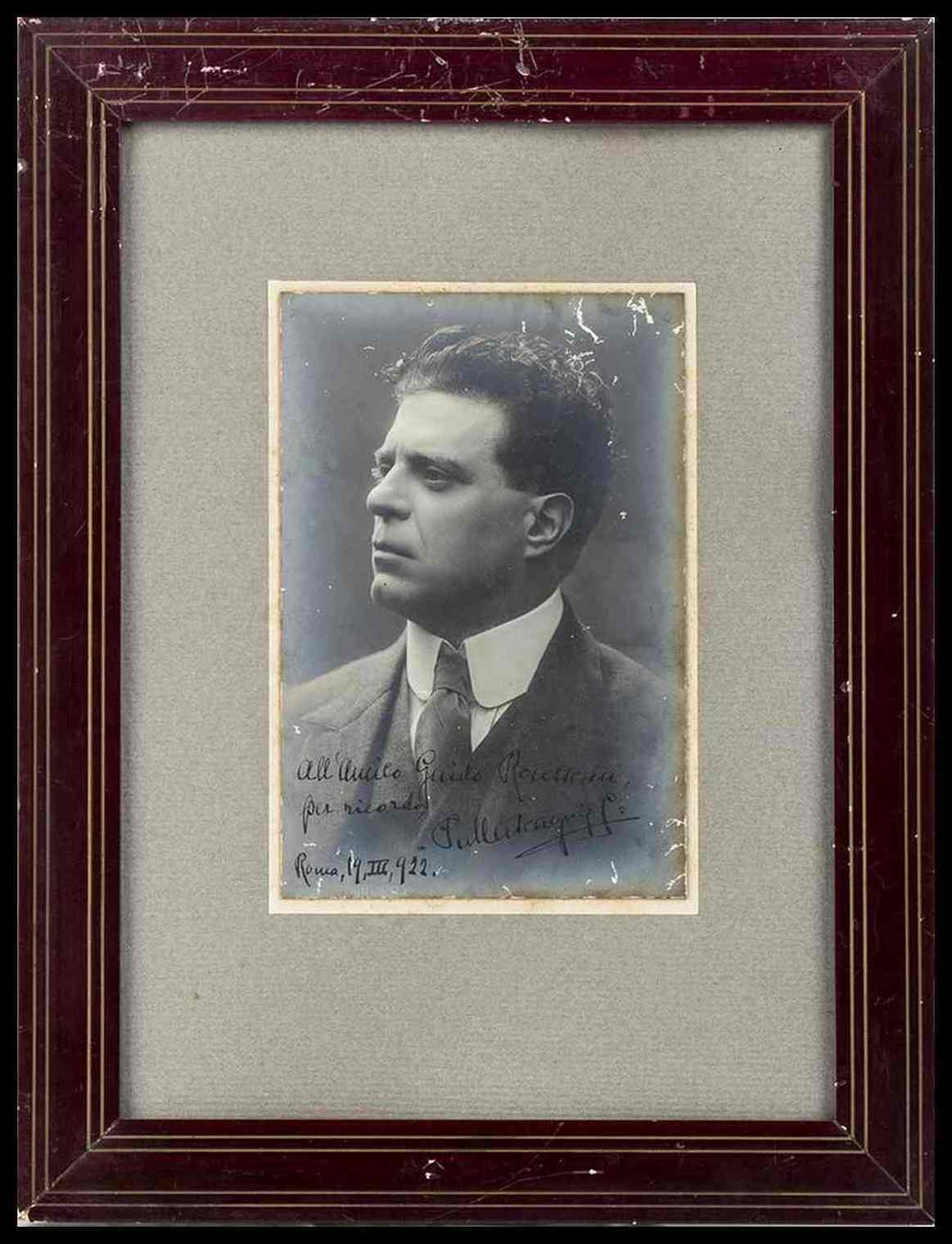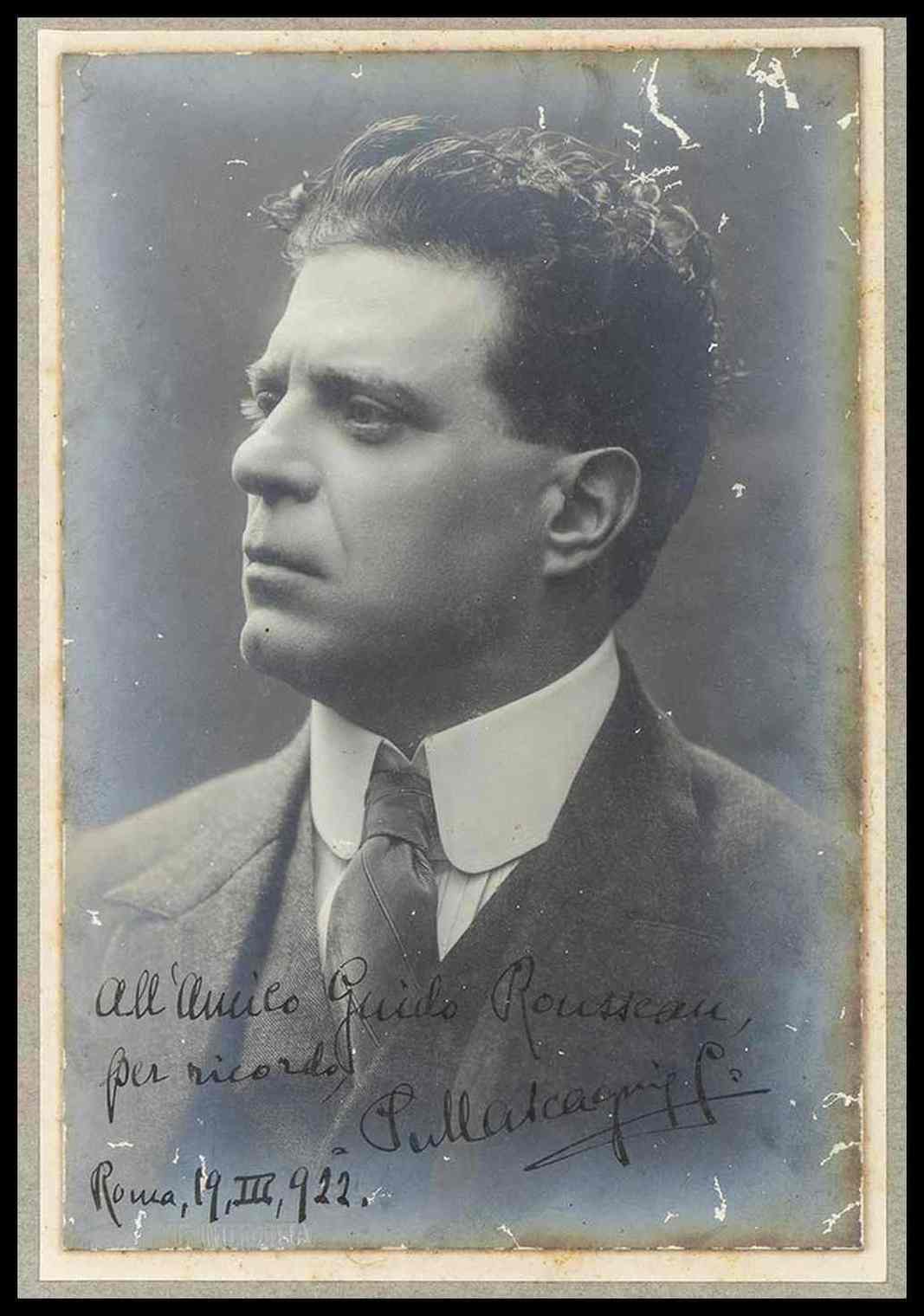 Bella foto ai Sali d'argento di Pietro Mascagni con dedica e firma autografe ad inchiostro nero "All'amico Rousseau, per ricordo, PMascagni - Roma , 19 , III . 922"