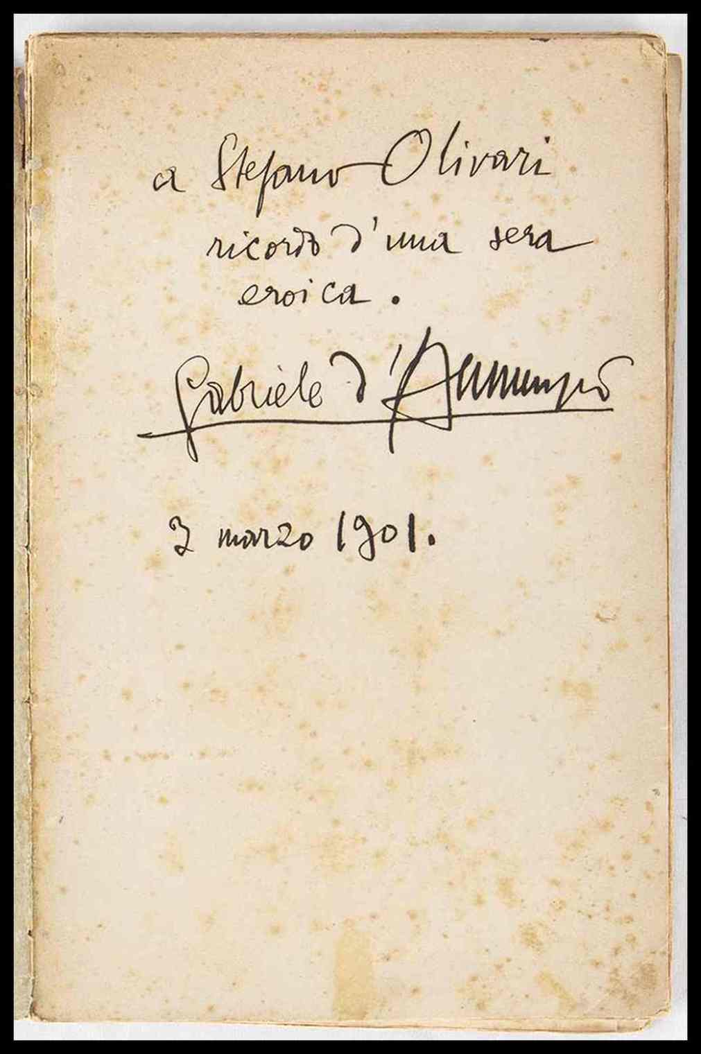 Volumetto dal titolo LA CANZONE DI GARIBALDI , editore F.lli Treves, 1901. Brossura editoriale, in 4° - Impreziosito alla prima pagina dalla dedica e firma autografe di Gabriele d'Annunzio , ad inchiostro nero, datata 3 Marzo 1901 coeva quindi alla pubblicazione dello stesso libretto