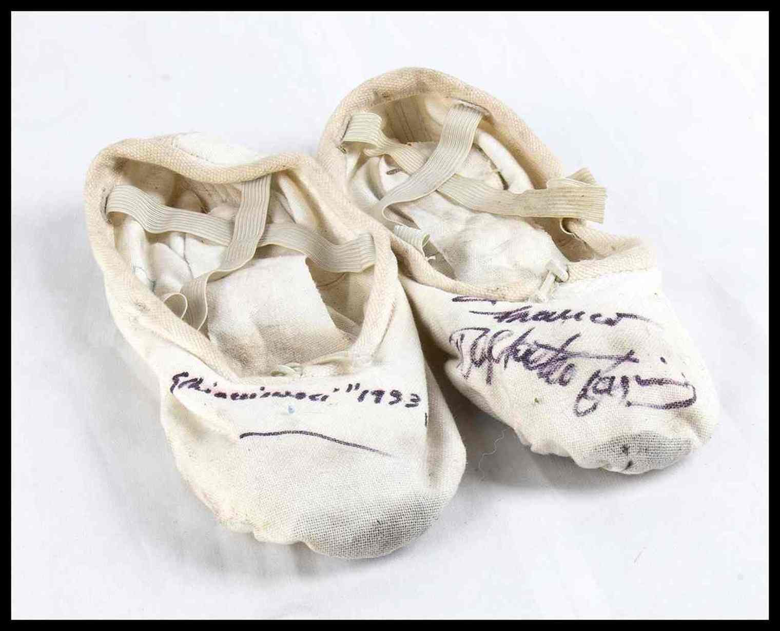 Scarpette usate da Paganini in scena al Teatro dell'Opera di Roma, per lo "Schiaccianoci" del 1993. Firma originale. Evidenti segni d'uso.
