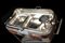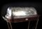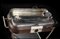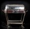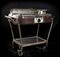 Grande carrello portavivande in lega PLAFOND marcato BROGGI - Milano. Usato a bordo del Transatlantico REX , splendido cimelio realizzato da maestri argentieri e architetti / designer nell'industria italiana. Sportello apribile a scomparsa, a rivelare gli scomparti porta vivande con coperchio. Adagiato ad incasso in un corpo sagomato perimetrale in legno. Struttura in metallo con zampe tubolari fornite di ruote e freni, piano inferiore per piatti o vasellame vario. Placchetta con marchio BROGGI MILANO , altra placchetta con simbolo di Italia Navigazione, applicate al corpo in legno. Due consistenti maniglie adatte al traporto del carrello