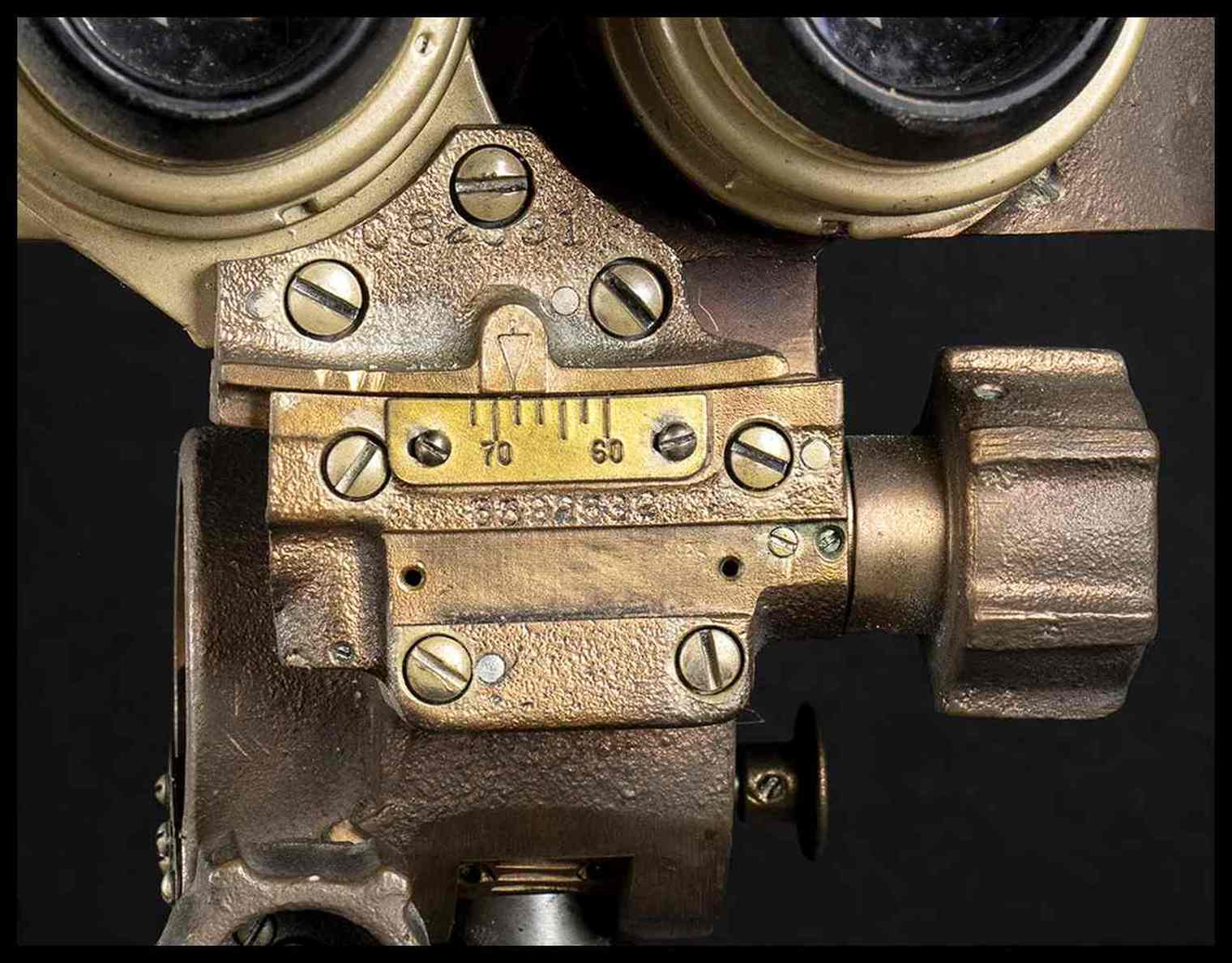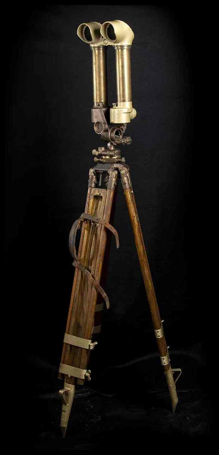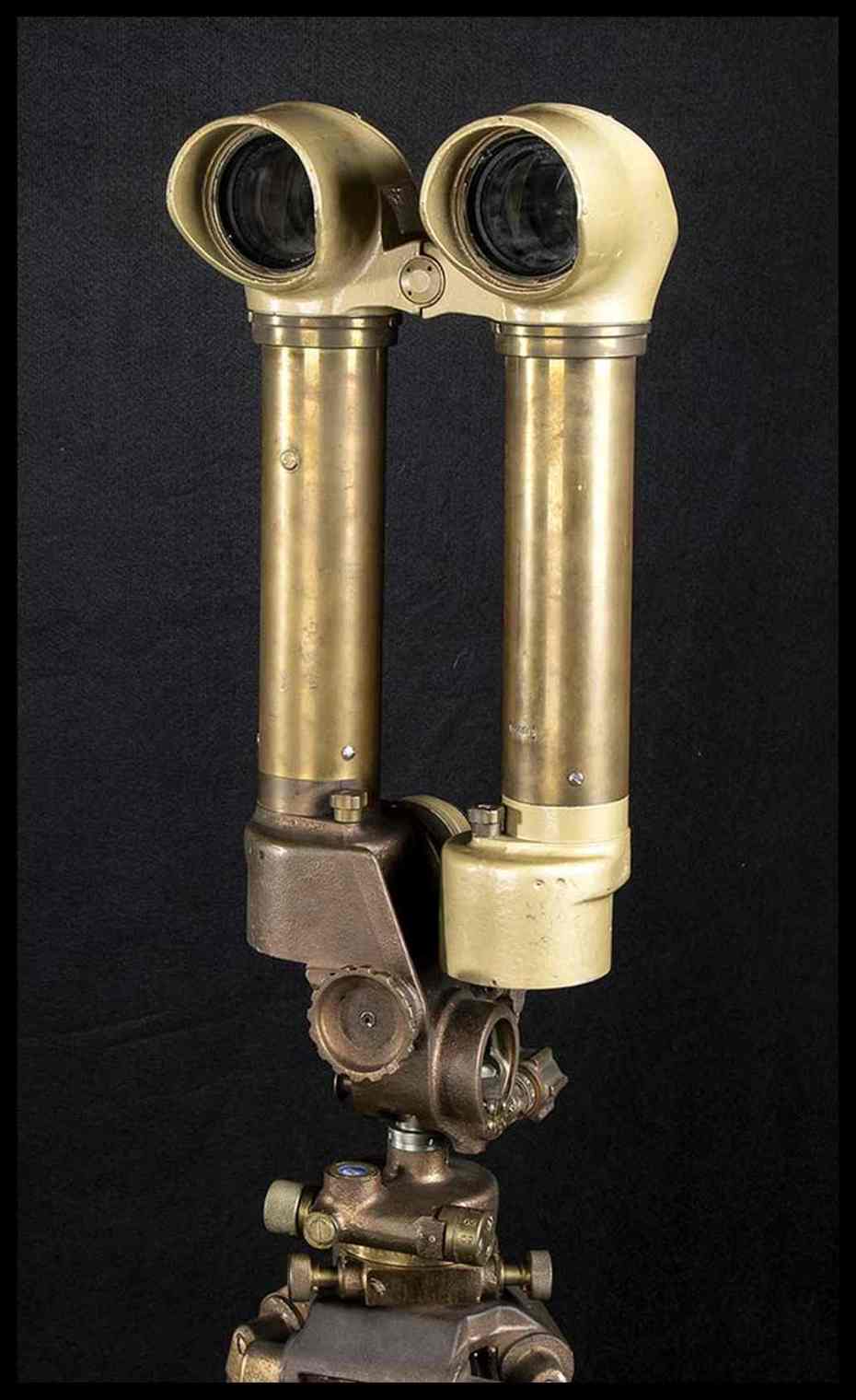 Raro periscopio militare da trincea, doppio corpo con lenti regolabile, meccaniche di orientamento, supporto con bolle per livellamento, punzonato con numeri identificativi 6180598. Completo del proprio treppiede in legno, con parti in ottone, e cinghie di chiusura integre