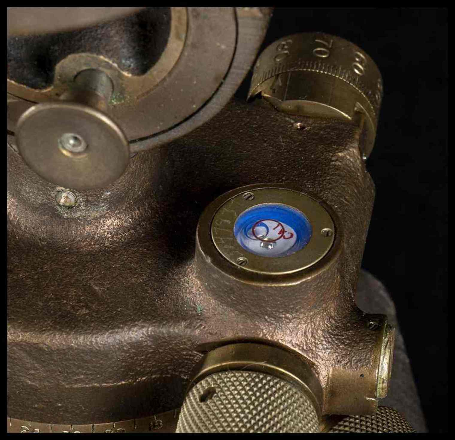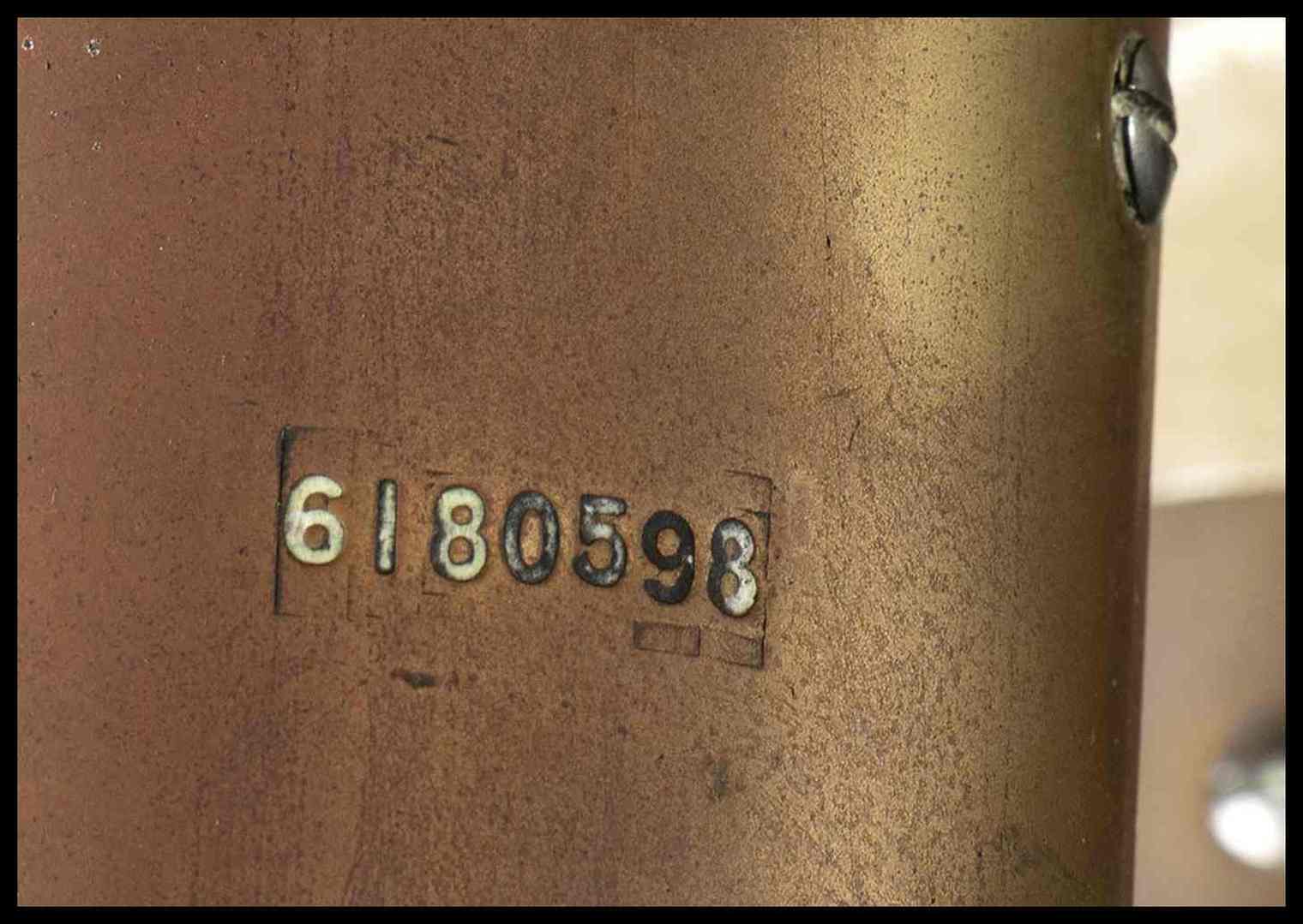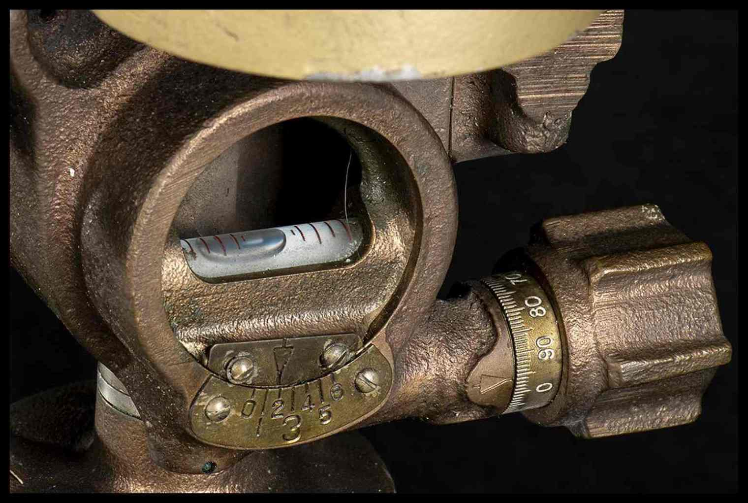 Raro periscopio militare da trincea, doppio corpo con lenti regolabile, meccaniche di orientamento, supporto con bolle per livellamento, punzonato con numeri identificativi 6180598. Completo del proprio treppiede in legno, con parti in ottone, e cinghie di chiusura integre