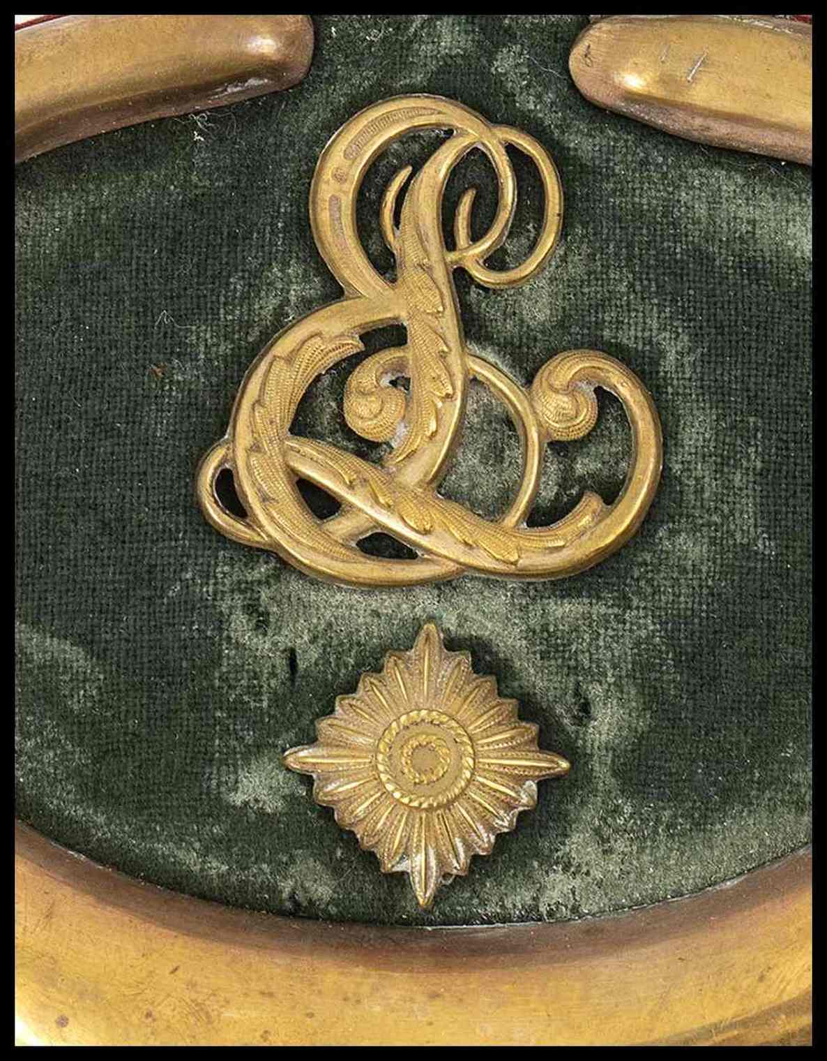 Antiche spalline da ufficiale superiore, panno verde scuro con monogramma EL in metallo giallo, cornice allo scudo in metallo stampato, galloncino argento filettato nero, frange argento,fondo amaranto
