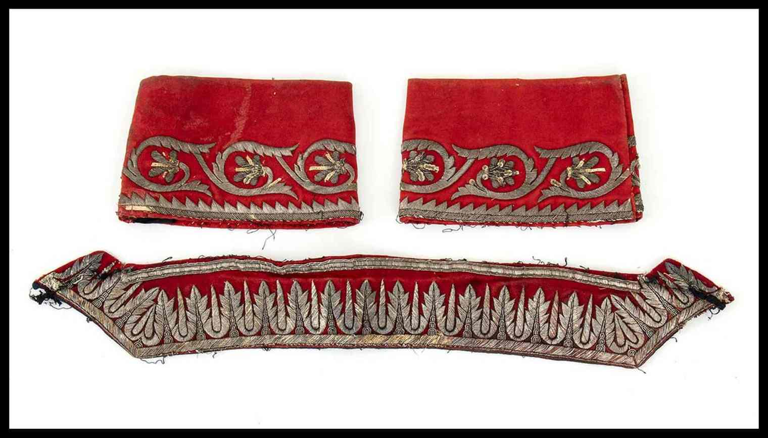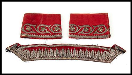 Decorazioni in ricamo d'argento su panno scarlatto per antica marsina da diplomatico o gentiluomo di corte