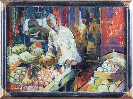 EMANUELE CAPPELLO Fruttivendolo olio su tela, firmato, in cornice cm 50x70 Al verso reca certificato di garanzia