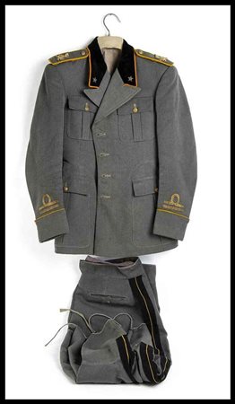 in gabardina di lana grigio verde, collo in veluto di seta nero, profilato giallo arancio, fregio di specialità alle controspalline, gradi a manica, pantaloni, in ottimo stato