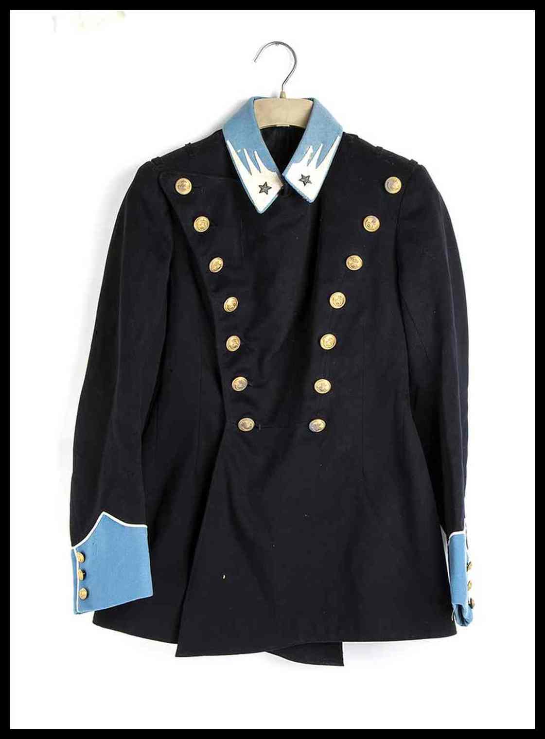 in gabardina di lana nera, collo celeste, caricato di fiamme a tre punte bianche