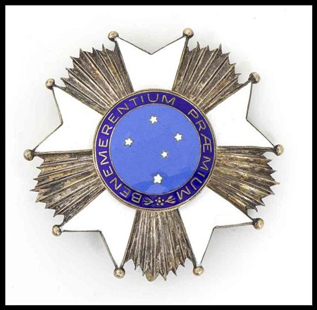 Placca di Gran Croce, argento, 72 mm, ottima fattura con scheggiatura allo smalto del braccio inferiore destro, al verso spillone centrale con marchi del fabbricante, La royale, Rio de Janeiro