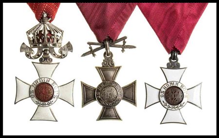 lotto di tre insegne dell’ordine di s. alessandro, una iv e v classe per meriti civili, una vi classe per meriti militari, tutte con nastro originale