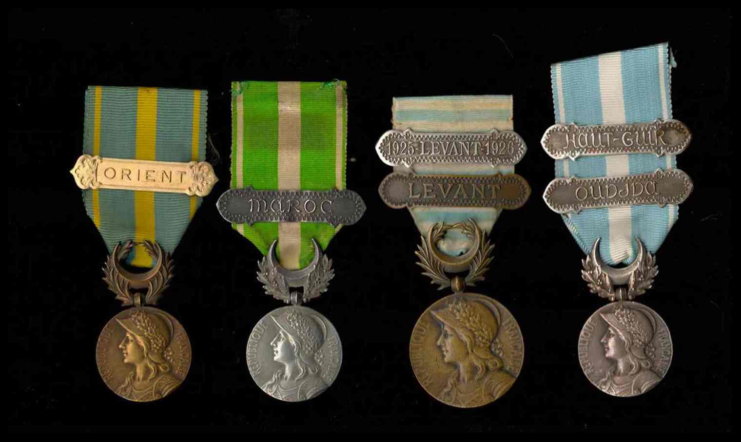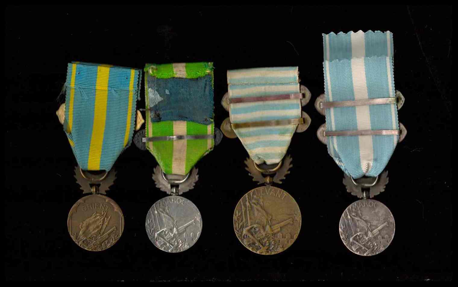 due medaglie in argento per la campagna di Marocco, con barrette, e due medaglie in bronzo per la Campagna d'Oriente. Ottimo stato, nastri originali