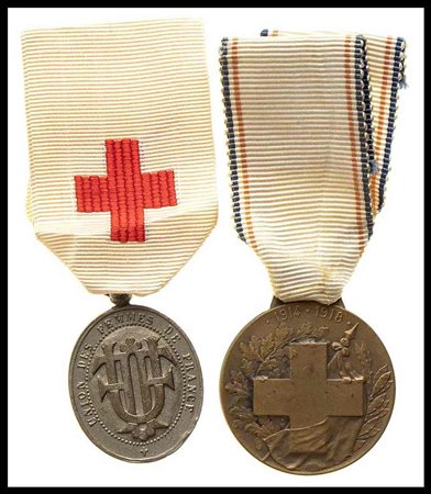 due medaglie della crf periodo grande guerra, una delle dames de france e una dell’associazione des femmes de france, nastri originali