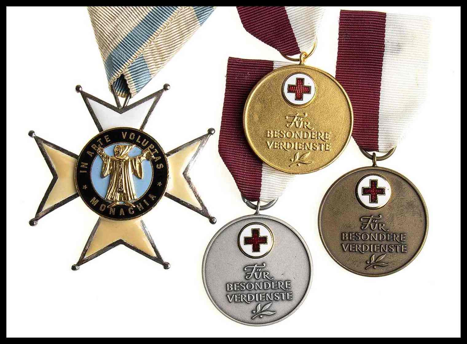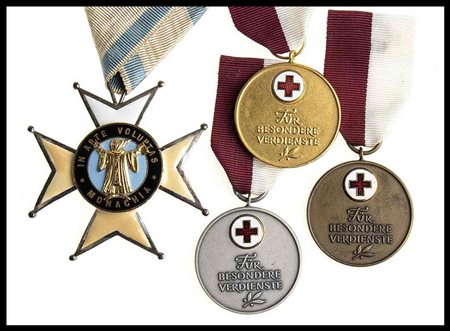 lotto di due croci al merito della croce rossa prussiana, una classe oro non smaltata ed una argento con smalti, nastri originali