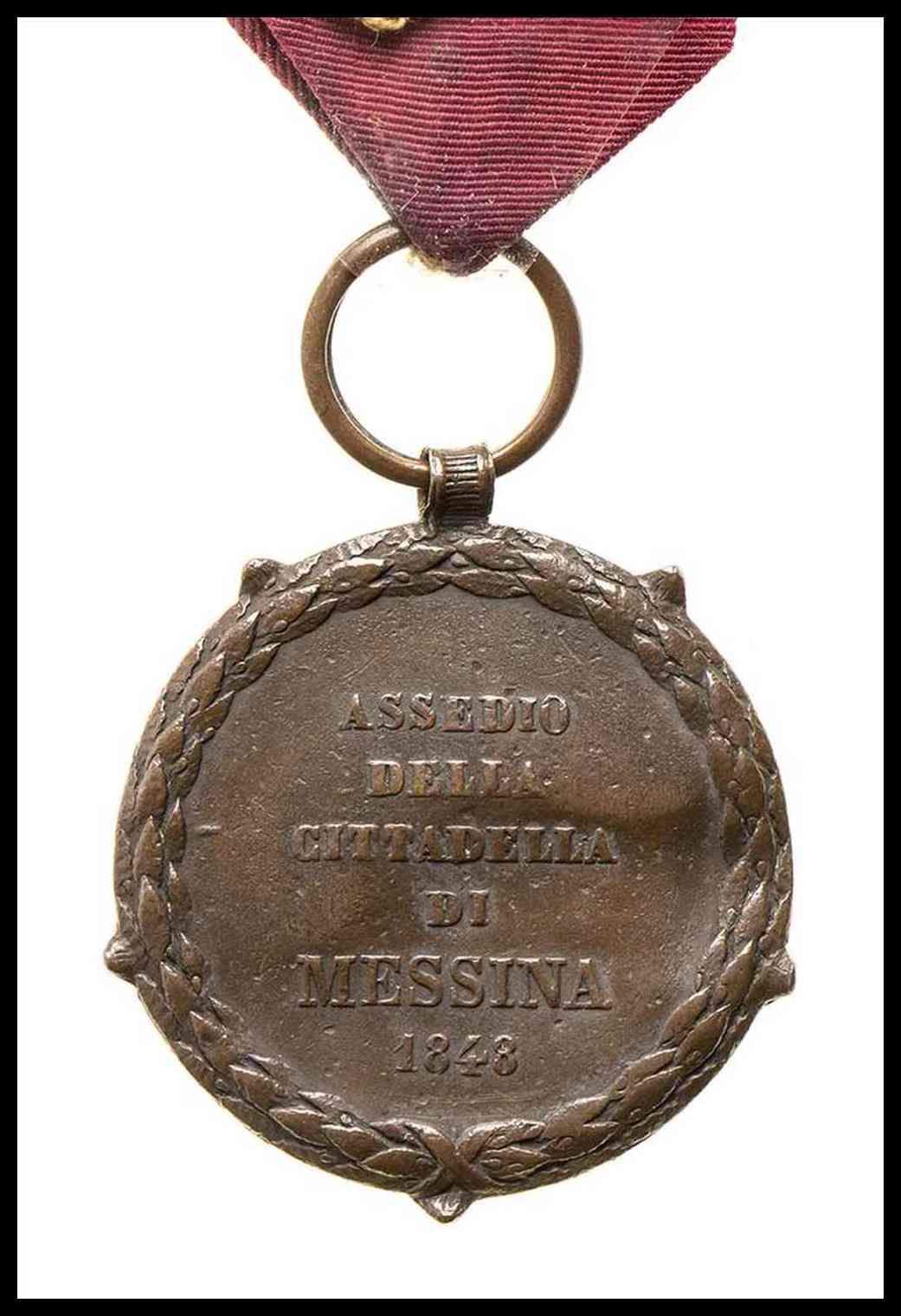 medaglia in bella patina, portata, coniata in occasione dell’assedio della cittadella di messina del 1848, bronzo con curiosa deformazione con affossamento del conio al verso della medaglia, la medaglia non è in fusione. nastro originale