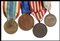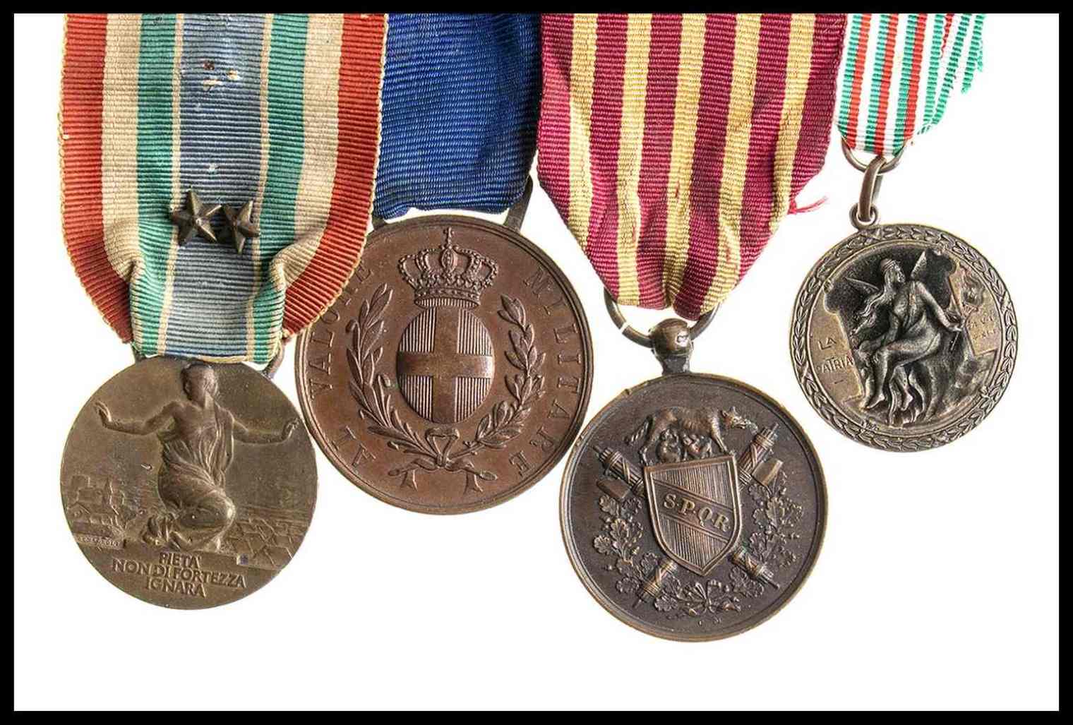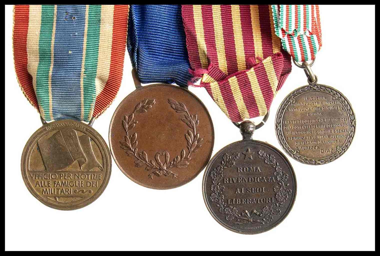 lotto di quattro medaglie, un vm di produzione privata, una commemorativa la presa di roma del 1870, una dell’ufficio notizie ed una commemorativa la vittoria sugli austriaci in bronzo con curiosa effigie della vittoria alata su smalto nero, nastri originali