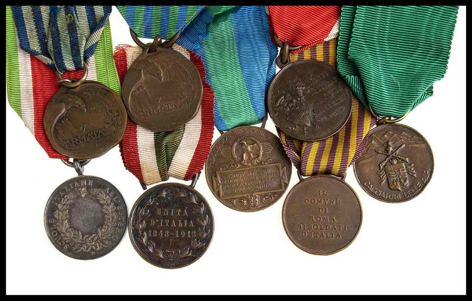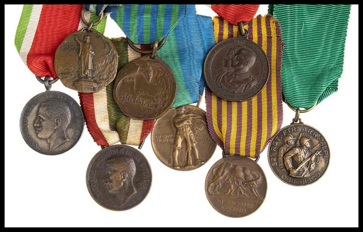 lotto composto da otto medaglie, una del raduno di trento per il cinquantenario del corpo, una medaglia del comune di roma per i reduci della grande guerra, due medaglie della settima armata, un’unita’d’italia, una in argento regia zecca delle scuole italiane aitmanuelealian all’estero, una in bronzo commemorativa le nozze di re vittorio emanuele iii, ed una repubblica