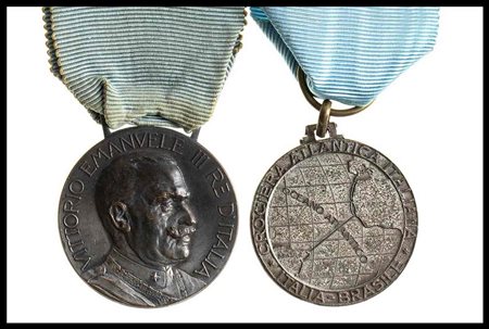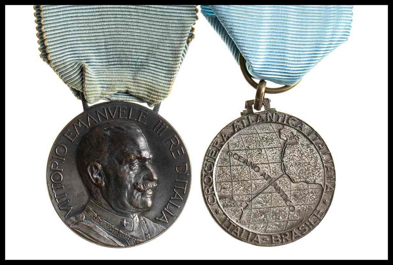 lotto formato da una medaglia per lunga navigazione aerea, non attribuita, ed una medaglia commemorativa la trasvolata italia- brasile, entrambe con tracce di ossidazione