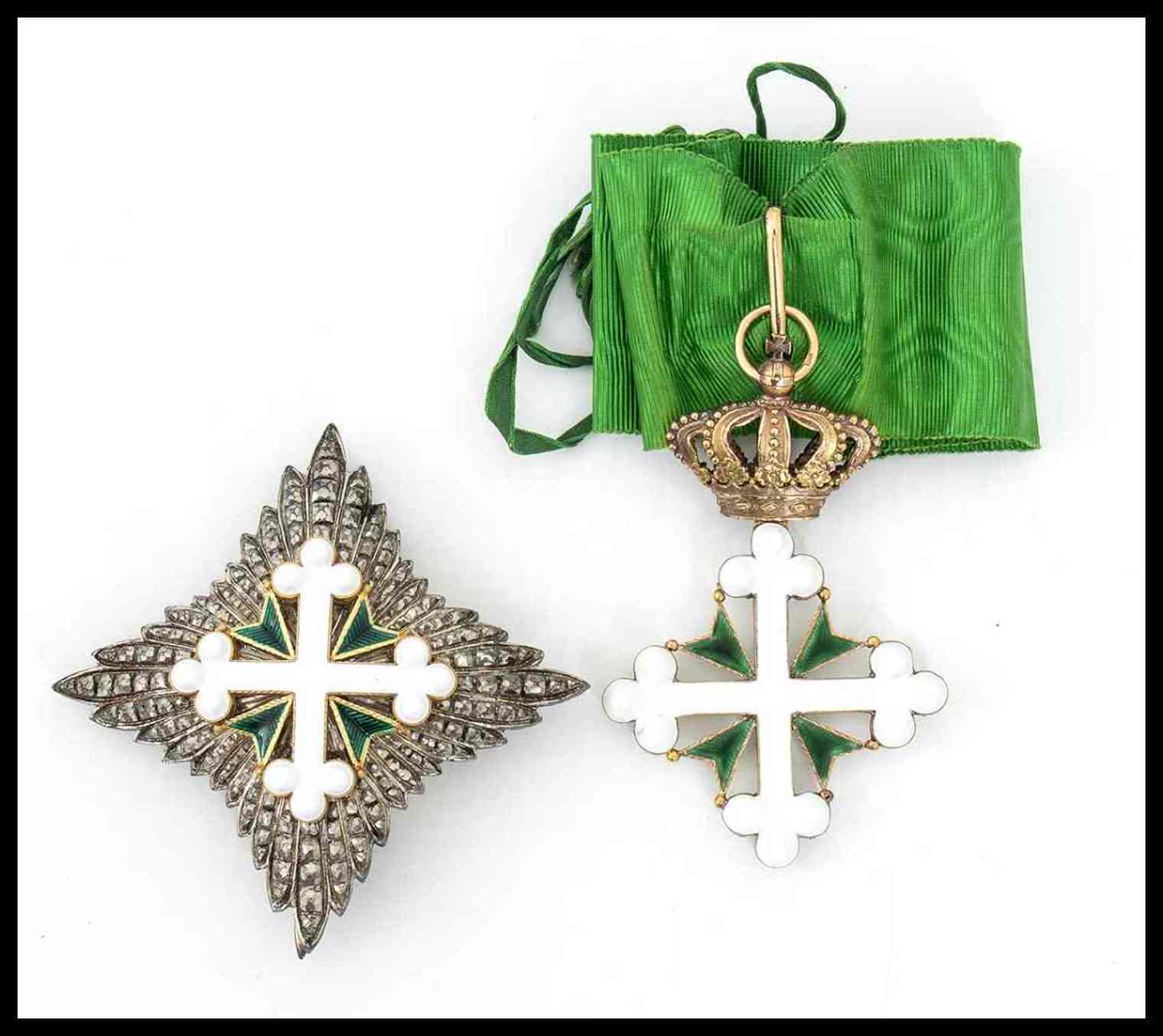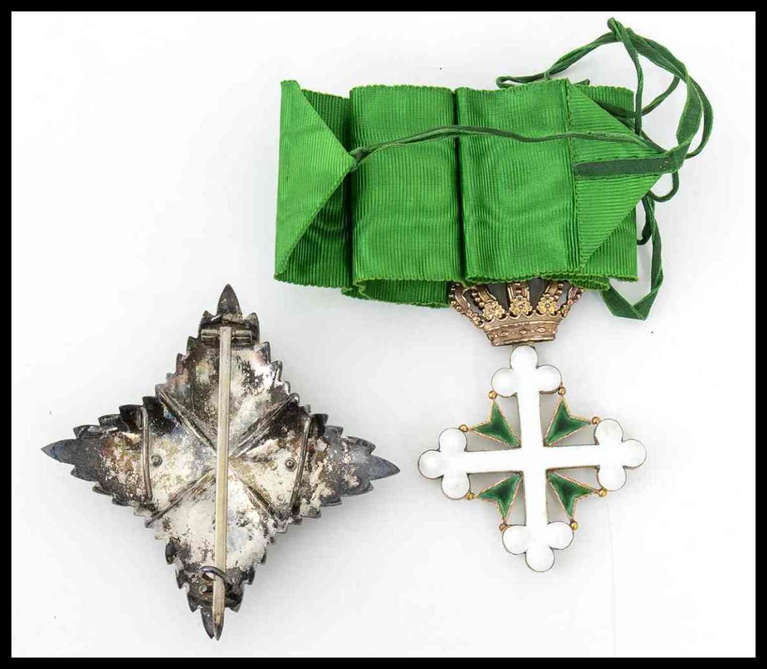 Bellissima ed antica insegna di Grandufficiale con placca in argento gettata, cesellata ed incisa a bulino con applicata croce in oro finemente smaltata, al verso spilla verticale accostata da due ardiglioni, la croce da collo è in oro e smalti finissimo, completa di nastro e conservata in astuccio con le cifre del re