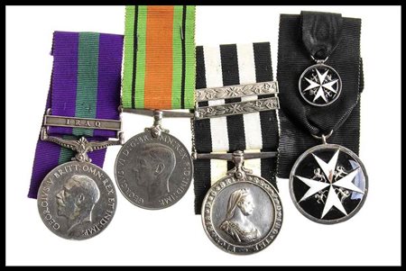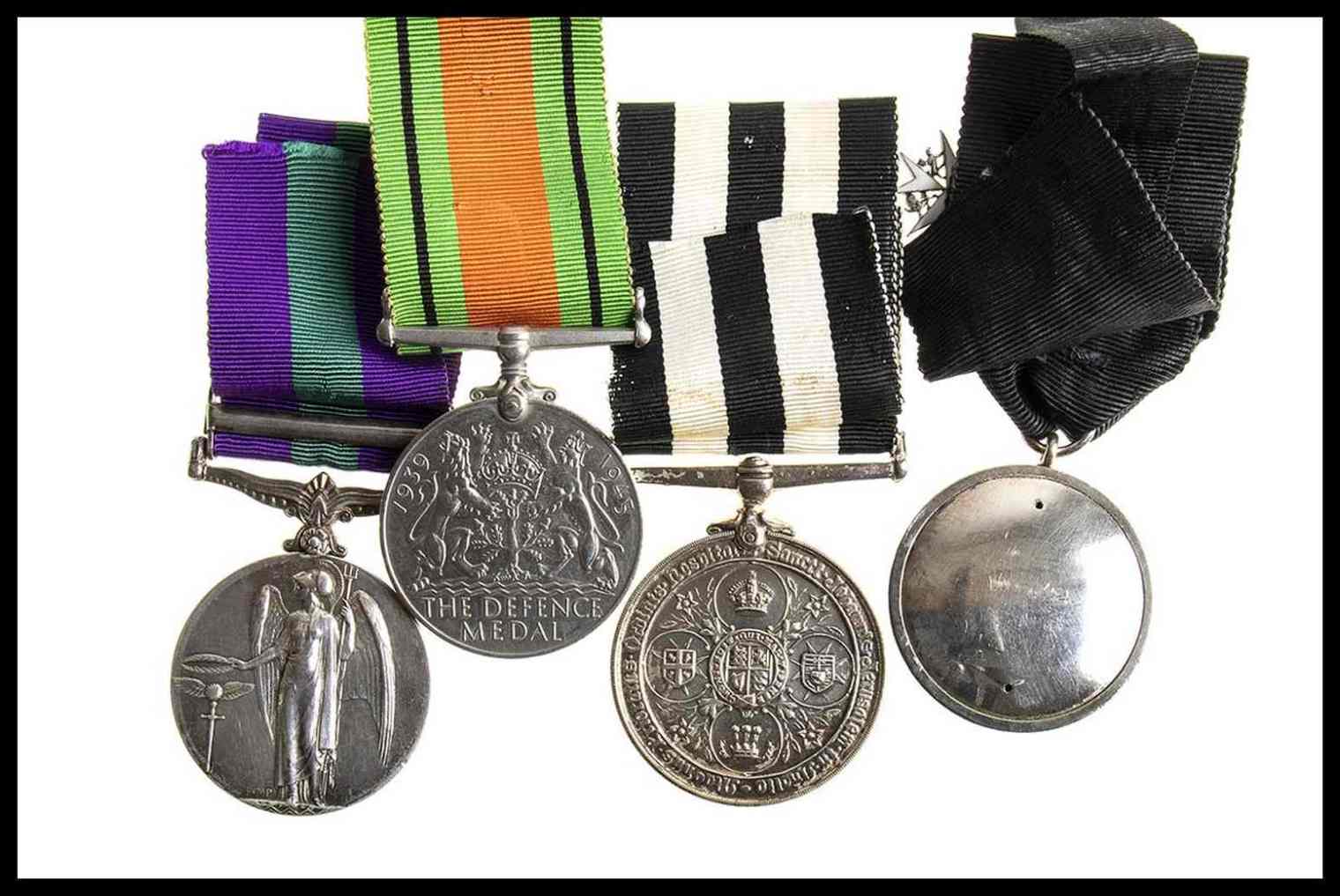 lotto composto da defense medal non attribuita, order of st. jhon da ufficiale con smalti danneggiati, medaglia di servizio dell’ordine di st. jhon, general service medal giorgio v attribuita 532609 pte l. west taylor 8-hrs. tutte con nastri originali