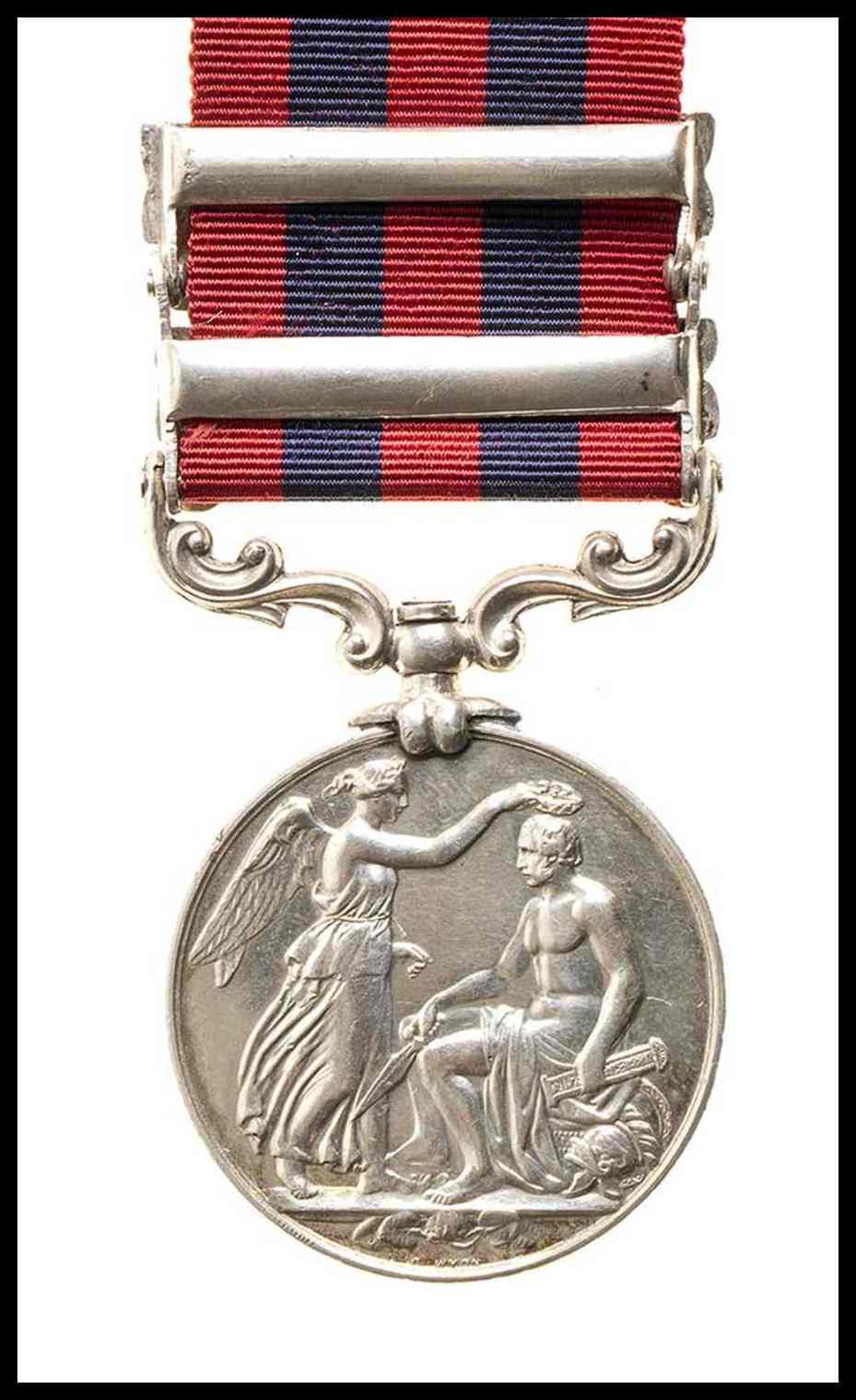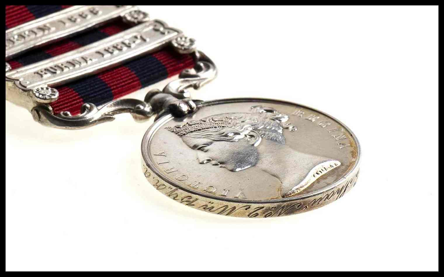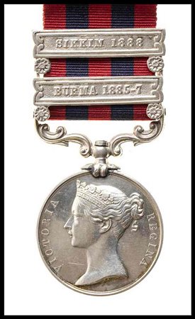 medaglia di servizio in india, due barrette, sikkim 1888, burma 1885-7, attribuita gurn.c.shaw n. 2° mem by r.a