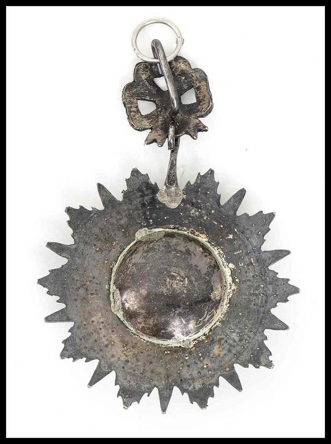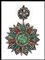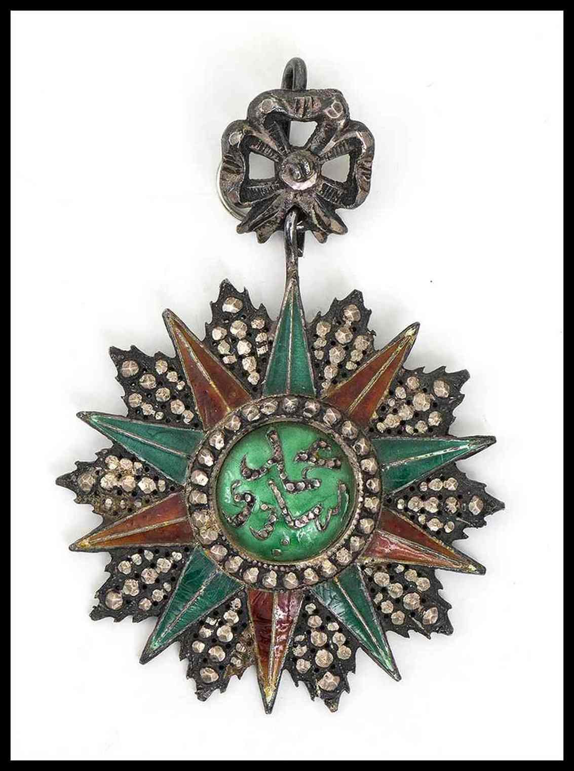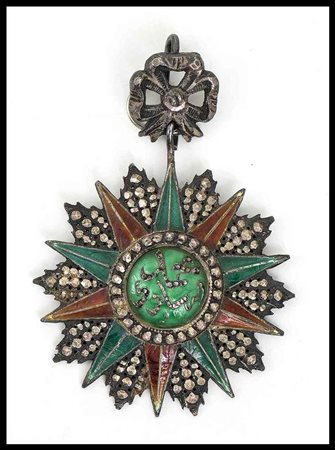 insegna di commendatore, gettato e cesellato, smalti, 64 mm, stella a dieci punte smaltate alternativamente di rosso e verde, gancio di sospensione a forma di fiocco, al centro medaglione con monogramma del Bey, fattura tunisina, buono stato, smalti approssimativi ma non danneggiati, senza nastro